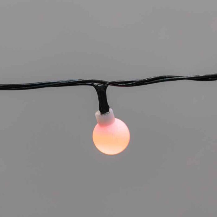 Пятиметровая гирлянда «Шарики» представляет собой ПВХ-провод с матовыми сферическими плафонами, излучающими разноцветный свет. Она состоит из 20 LED-лампочек.