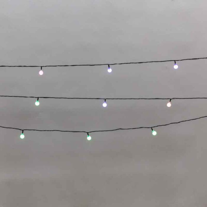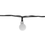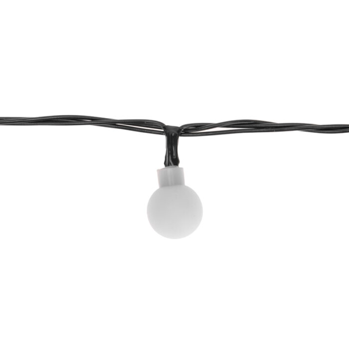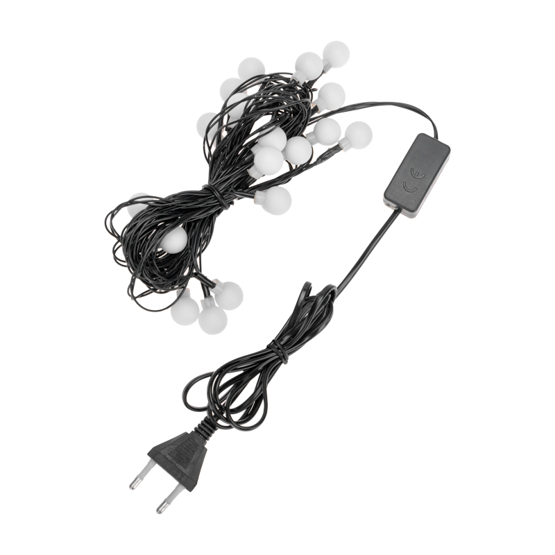 Пятиметровая гирлянда "Шарики" представляет собой ПВХ-провод с матовыми сферическими плафонами, излучающими разноцветный свет. Она состоит из 20 LED-лампочек.