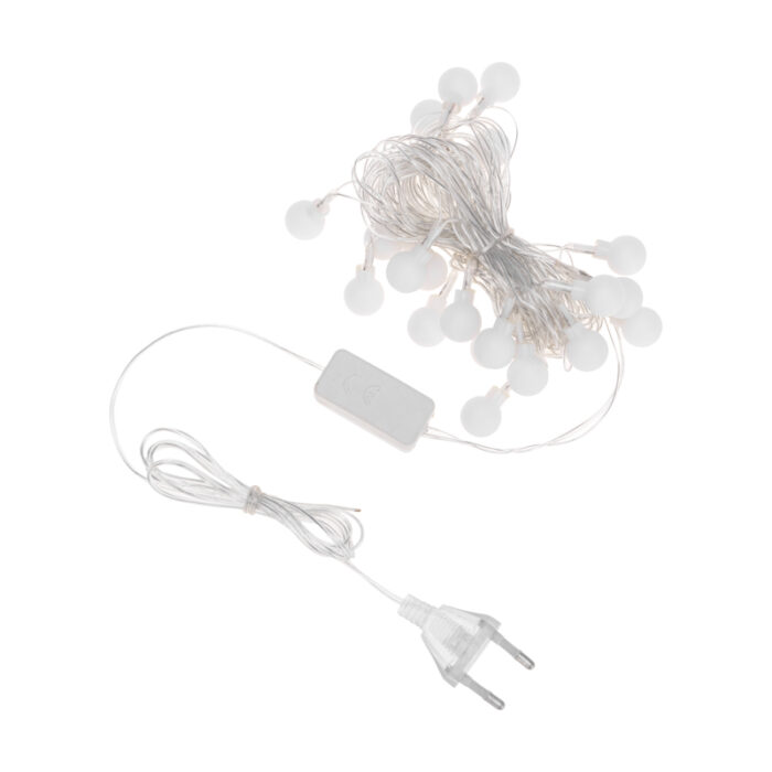 Пятиметровая гирлянда "Шарики" представляет собой ПВХ-провод с матовыми сферическими плафонами, излучающими разноцветный свет. Она состоит из 20 LED-лампочек.