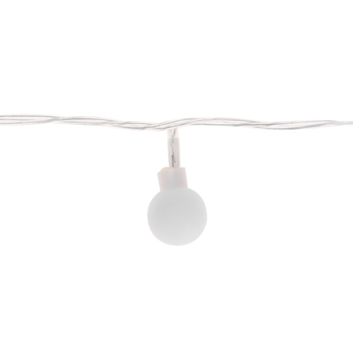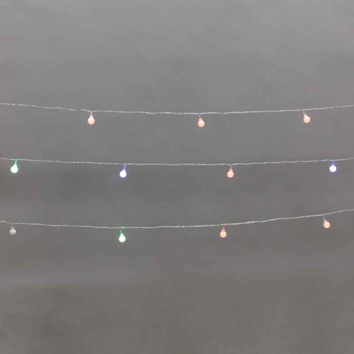 Пятиметровая гирлянда «Шарики» представляет собой ПВХ-провод с матовыми сферическими плафонами, излучающими разноцветный свет. Она состоит из 20 LED-лампочек.