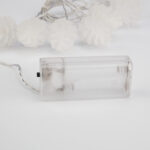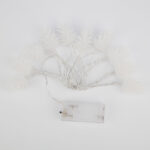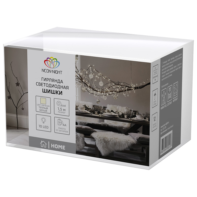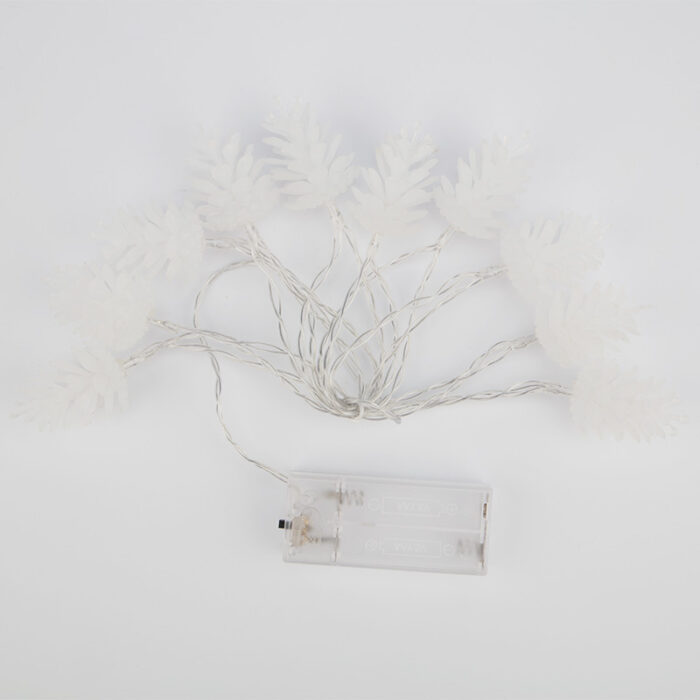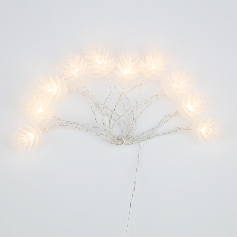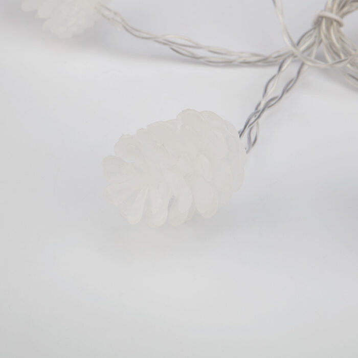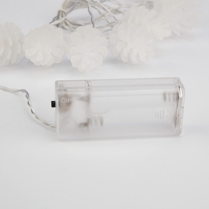 Десять насадок в форме шишек из жаропрочного пластика ярко освещаются диодами. Компактный батарейный блок надежно закрывается крышкой. Диоды испускают мягкий белый свет теплого тона и работают от двух батареек АА. Эта гирлянда, не требующая подключения к электросети, представляет собой безопасный вариант для украшения детских комнат.