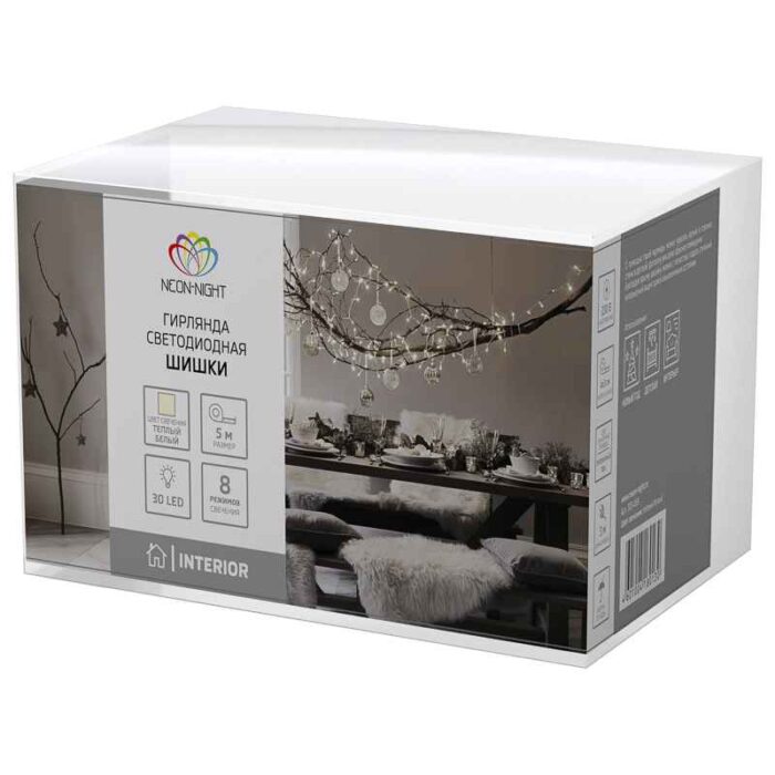 Пятиметровая светодиодная гирлянда «Шишки» станет прекрасным дополнением к праздничному убранству вашей елки, выполненному в классическом новогоднем стиле. На электрическом проводе, с интервалом в 16 сантиметров, размещены 30 декоративных элементов в форме шишек.