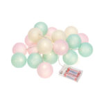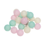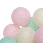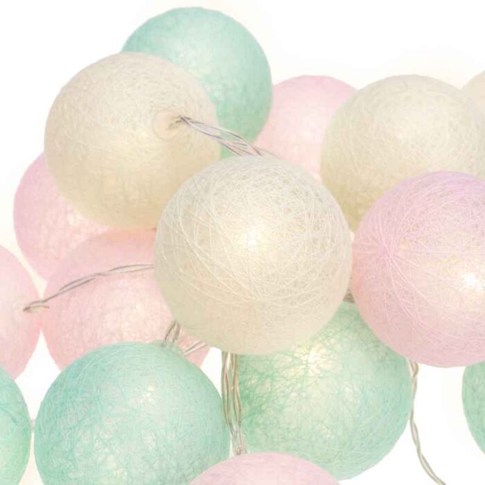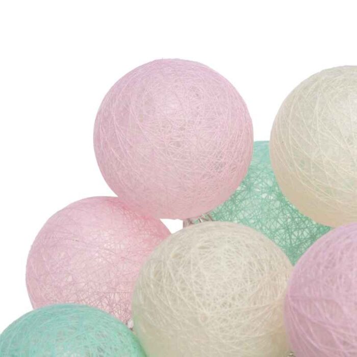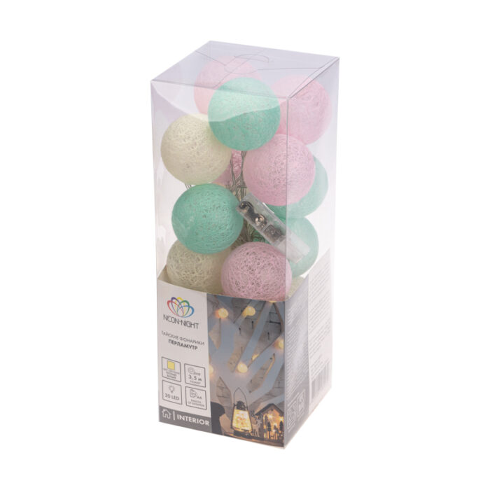 Изделие состоит из 20 круглых фонариков, изготовленных из хлопковых нитей и размещенных на проводе с прозрачной ПВХ изоляцией, что придает ему легкость и воздушность.