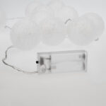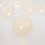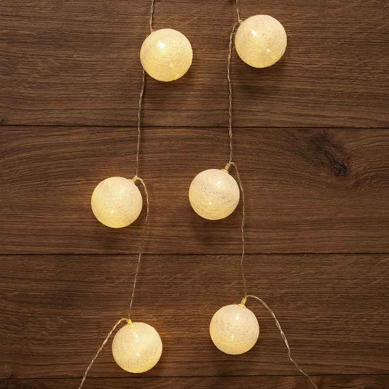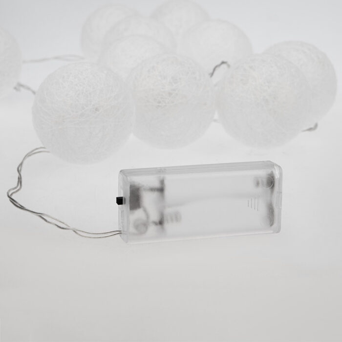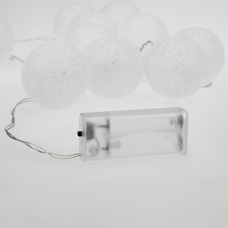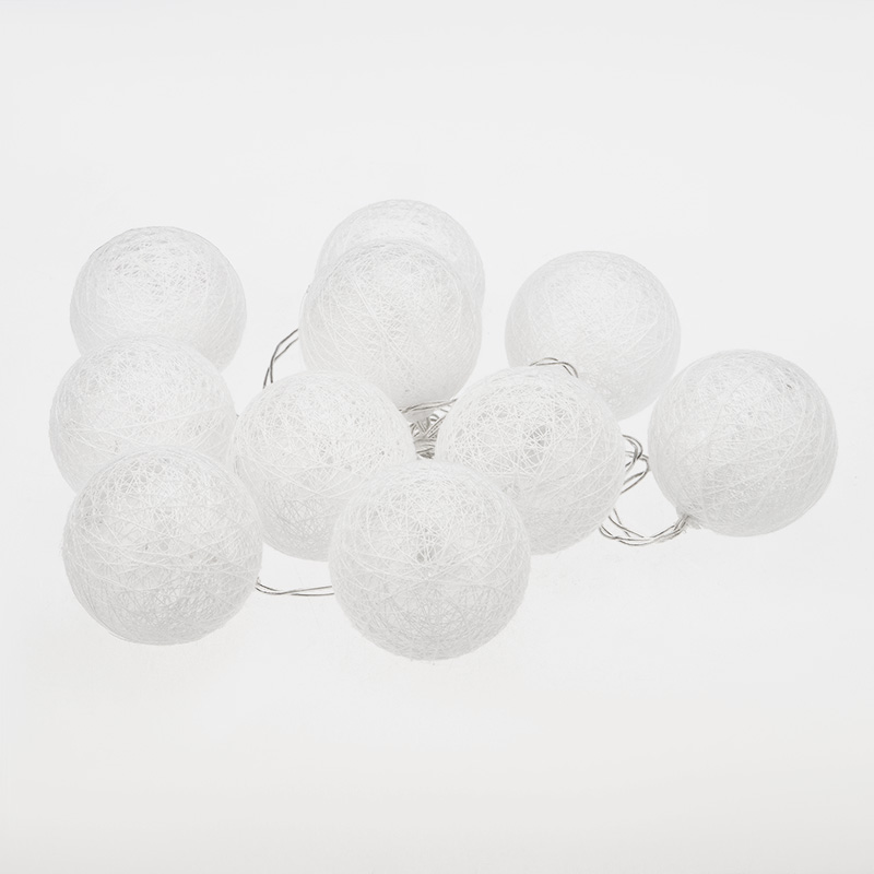 Внутри каждого из шарообразных абажуров из хлопковой пряжи размещены 10 светодиодов, которые деликатно смягчают интенсивный свет, наполняя пространство ощущением тепла и расслабления. Тканевые украшения в красных, синих, пурпурных и жёлтых оттенках преобразят интерьер детской, комнаты отдыха или фотостудии, даже когда гирлянда не светится. Работает гирлянда от трех батареек формата АА, что позволяет использовать её в качестве прикроватного ночника в спальнях и детских.