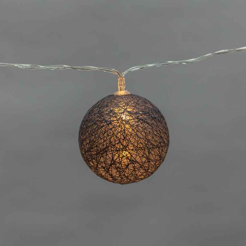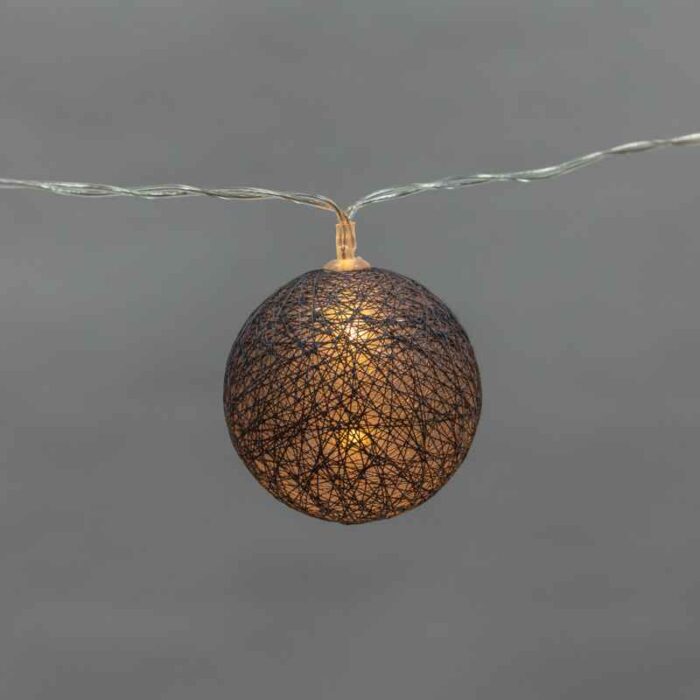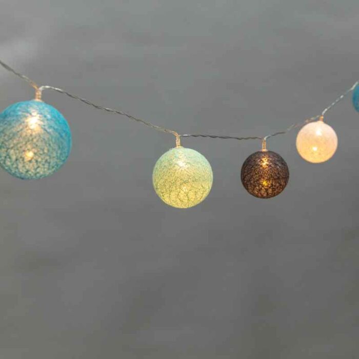 Изделие состоит из 20 круглых фонариков, изготовленных из хлопковых нитей и размещенных на проводе с прозрачной ПВХ изоляцией, что придает ему легкость и воздушность.