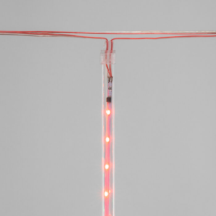 За динамику свечения, имитирующую стекающие капли воды, отвечает встроенный микроконтроллер. В комплект поставки входит трансформатор. Длина провода питания составляет полтора метра. Эта гирлянда принесет в ваш дом неповторимую атмосферу праздника и волшебства.