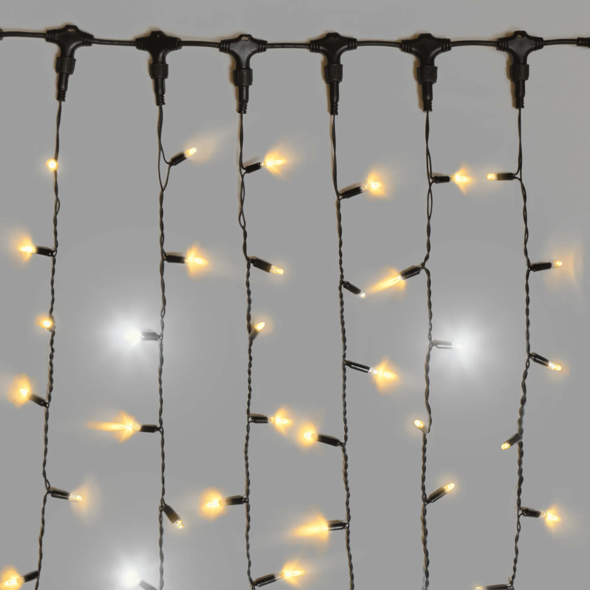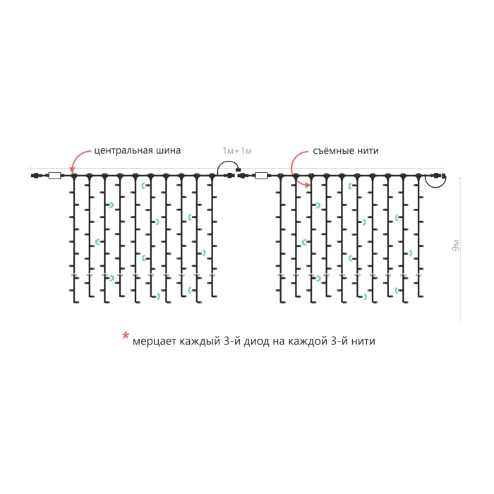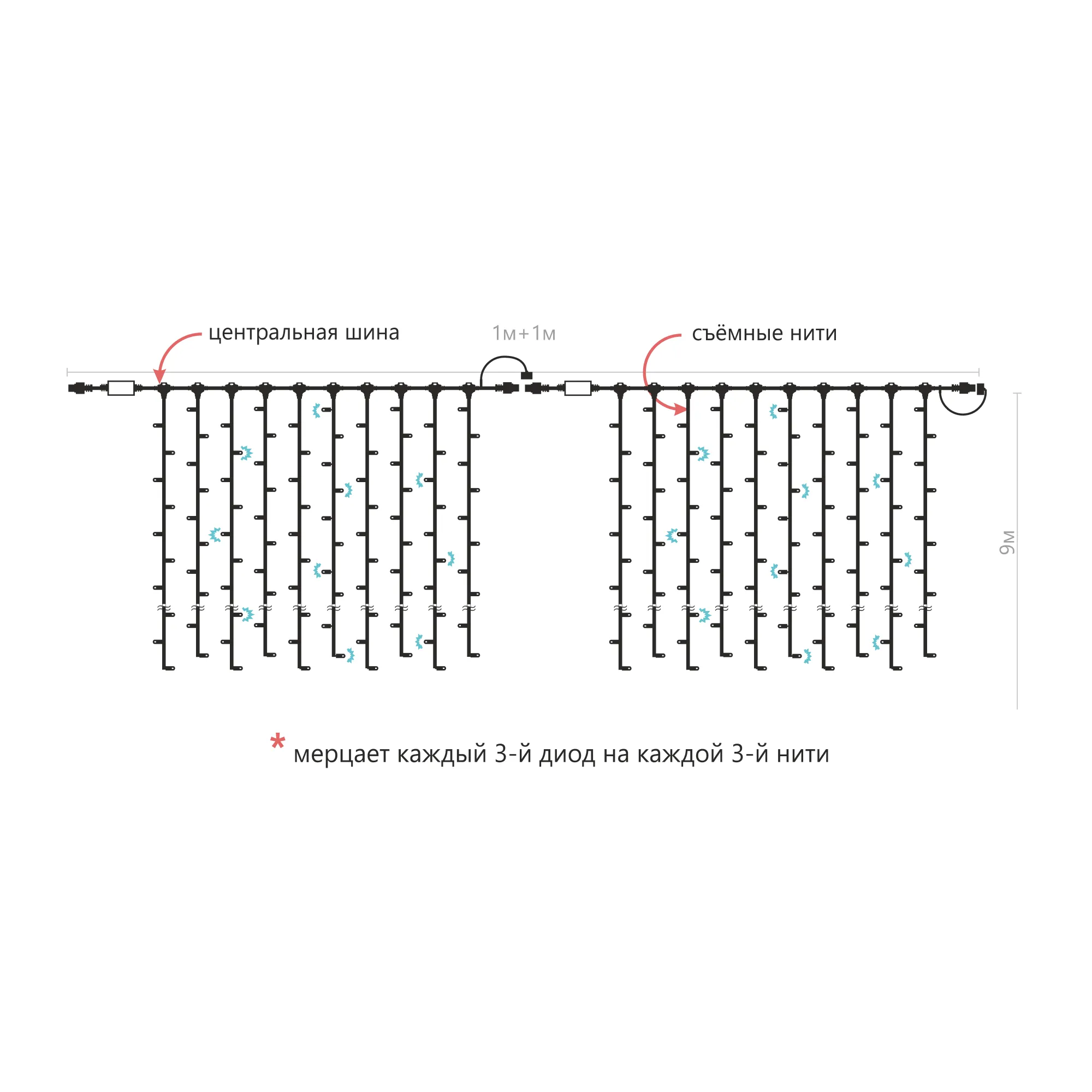 Гирлянда Занавес 2×9 м. Теплый Белый 220В, 1500 LED, Провод Черная Резина, Мерцающий, IP65