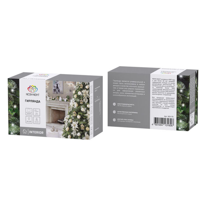 Длина — 10 метров, легко оборачивает стандартную ёлку или большую арку;