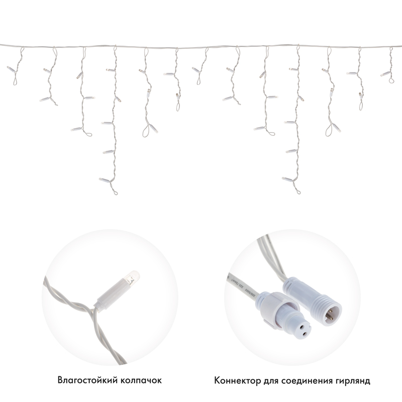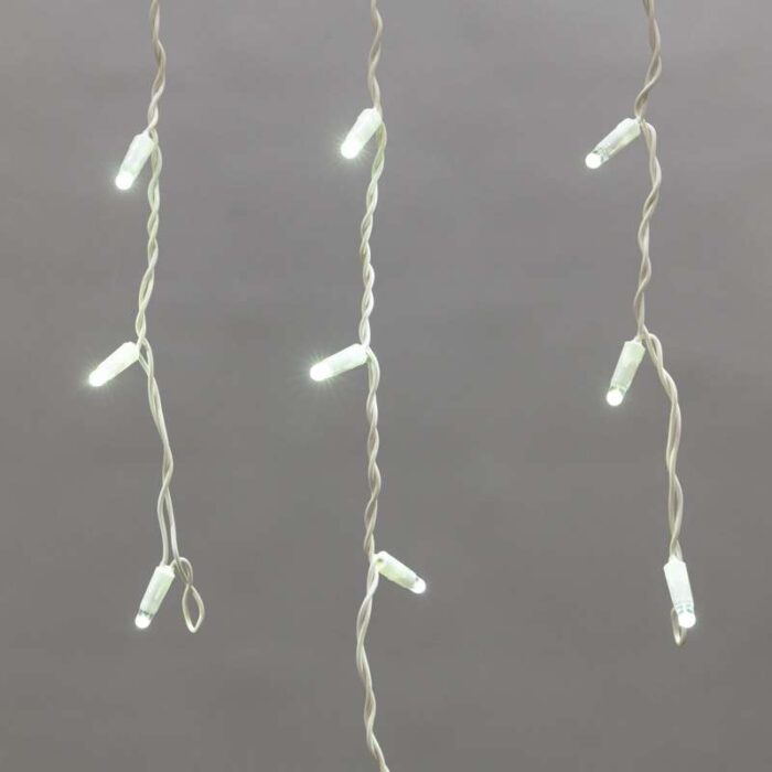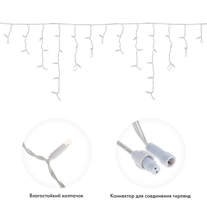 Компактная гирлянда-бахрома длиной 1,8 м с холодным белым свечением. Подходит для акцентной подсветки окон, фасадов, арок и балконов. Белый провод, степень защиты IP65, 48 диодов. Надёжное решение для улицы и дома. Готова к подключению, соединяется в цепь до 50 м.