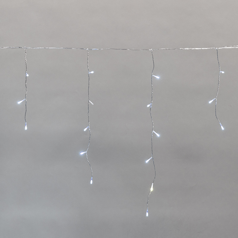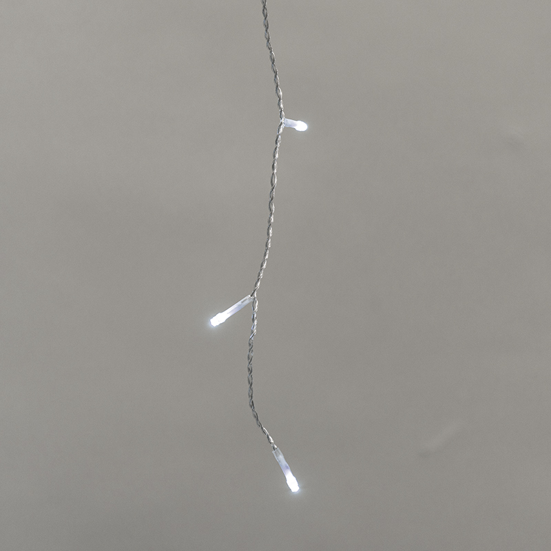 Универсальная бахрома длиной 10 м с белым свечением и лёгким мерцанием. Прозрачный ПВХ-провод, защита IP44, питание 230 В. Подходит для фасадов, балконов, окон и террас. Соединяется до 50 метров, есть сетевой шнур. Отличное решение по соотношению цена/качество.