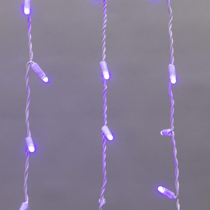 Гирлянда-бахрома с насыщенным синим свечением — эффектный выбор для уличной и интерьерной подсветки. Питание от сети 230 В, уровень защиты IP65, белый ПВХ-провод. Объединяется в цепь до 48 метров. Подходит для оформления крыш, фасадов и заборов.