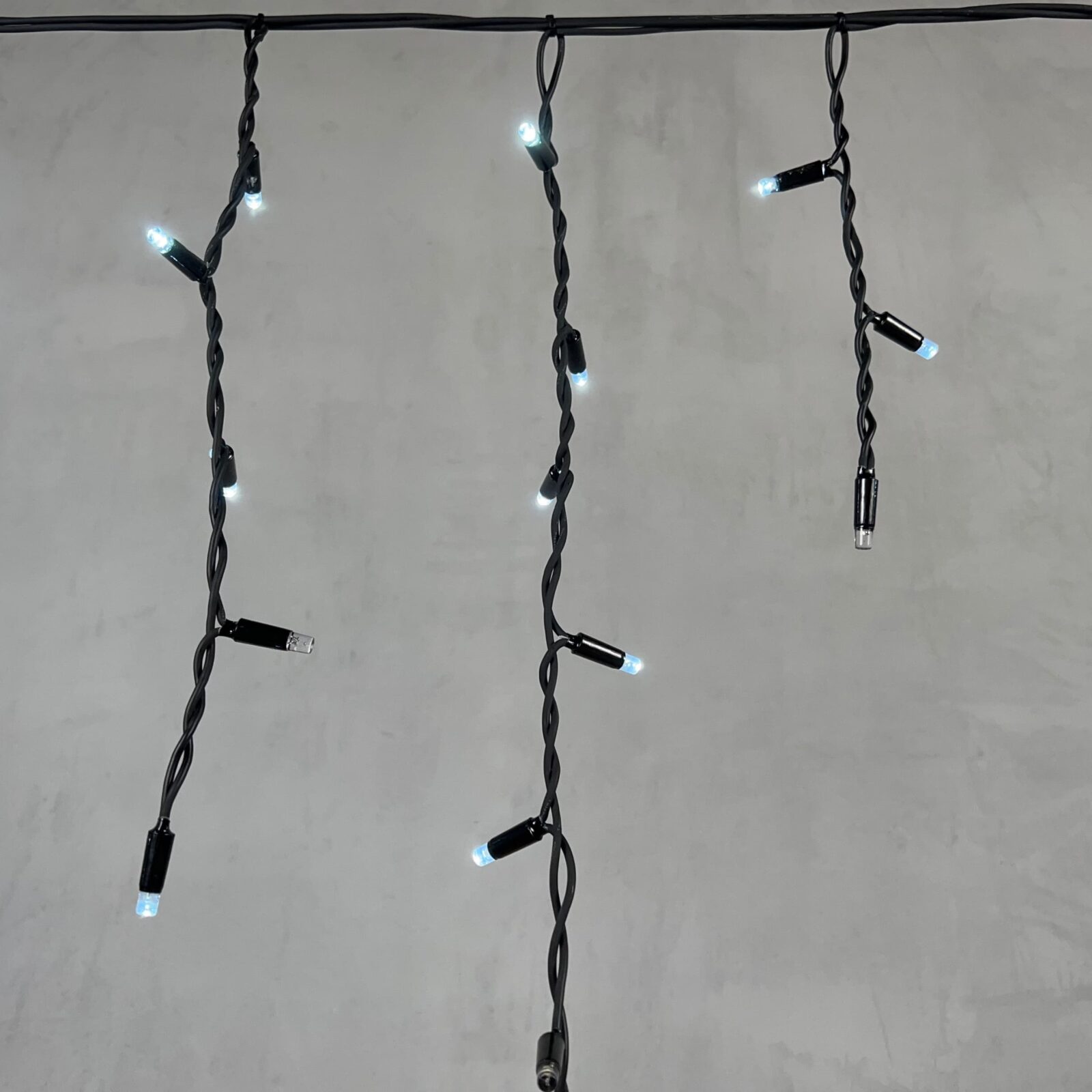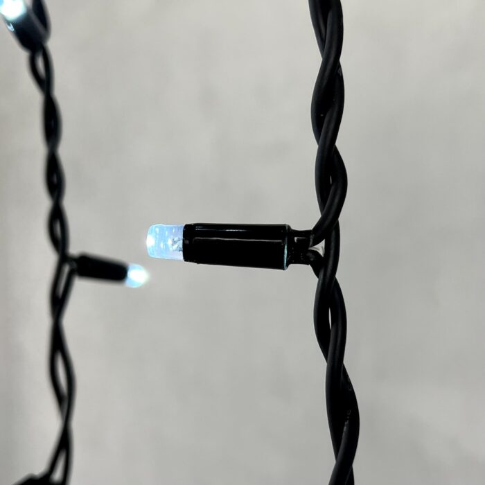В основе гирлянды — прочный чёрный провод из морозостойкого каучука толщиной 3,3 мм. Это материал, рассчитанный на многолетнюю эксплуатацию на улице. Он не дубеет на морозе, не трескается, устойчив к ультрафиолету, изгибам, осадкам и механическим нагрузкам. Чёрный цвет универсален — его не видно днём на тёмных фасадах, он не пачкается и сохраняет аккуратный внешний вид в течение всего сезона.