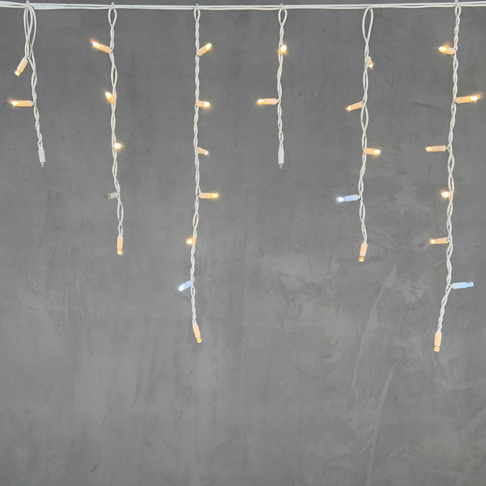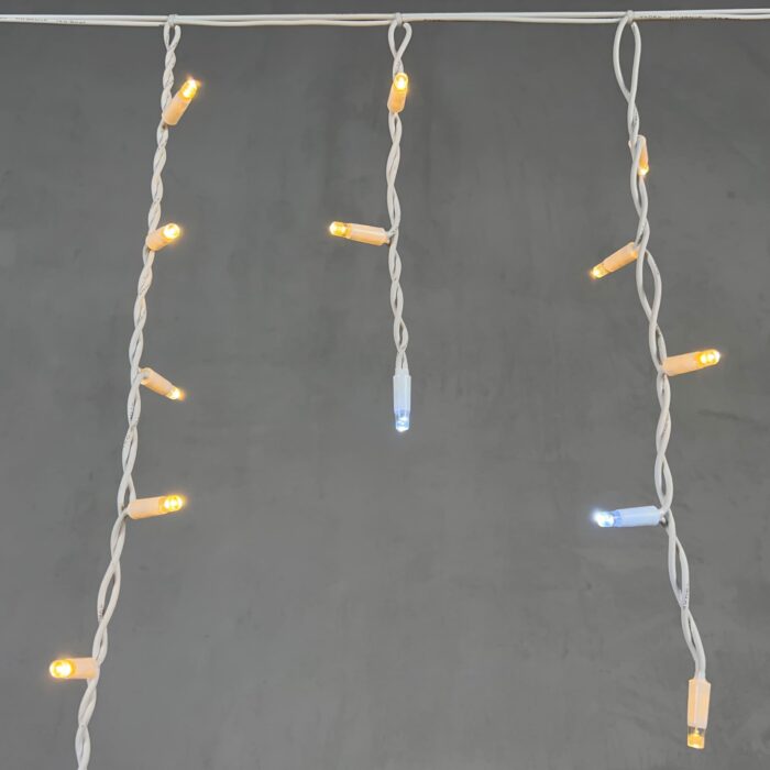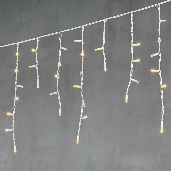 Профессиональная гирлянда бахрома 3,1 м с тёплым белым свечением и эффектом мерцания. Надёжный белый каучуковый провод, 120 диодов, защита IP65. Идеально для фасадов частных домов.