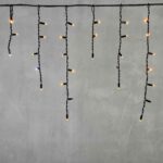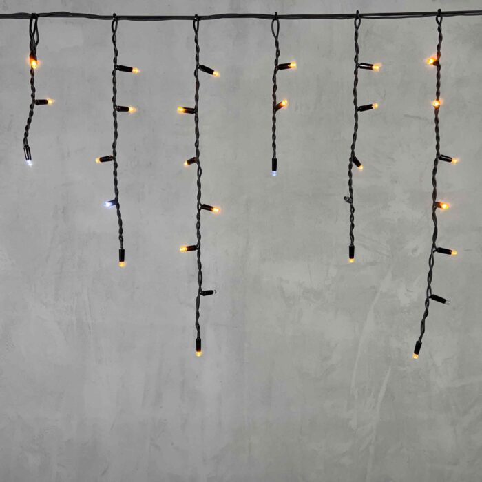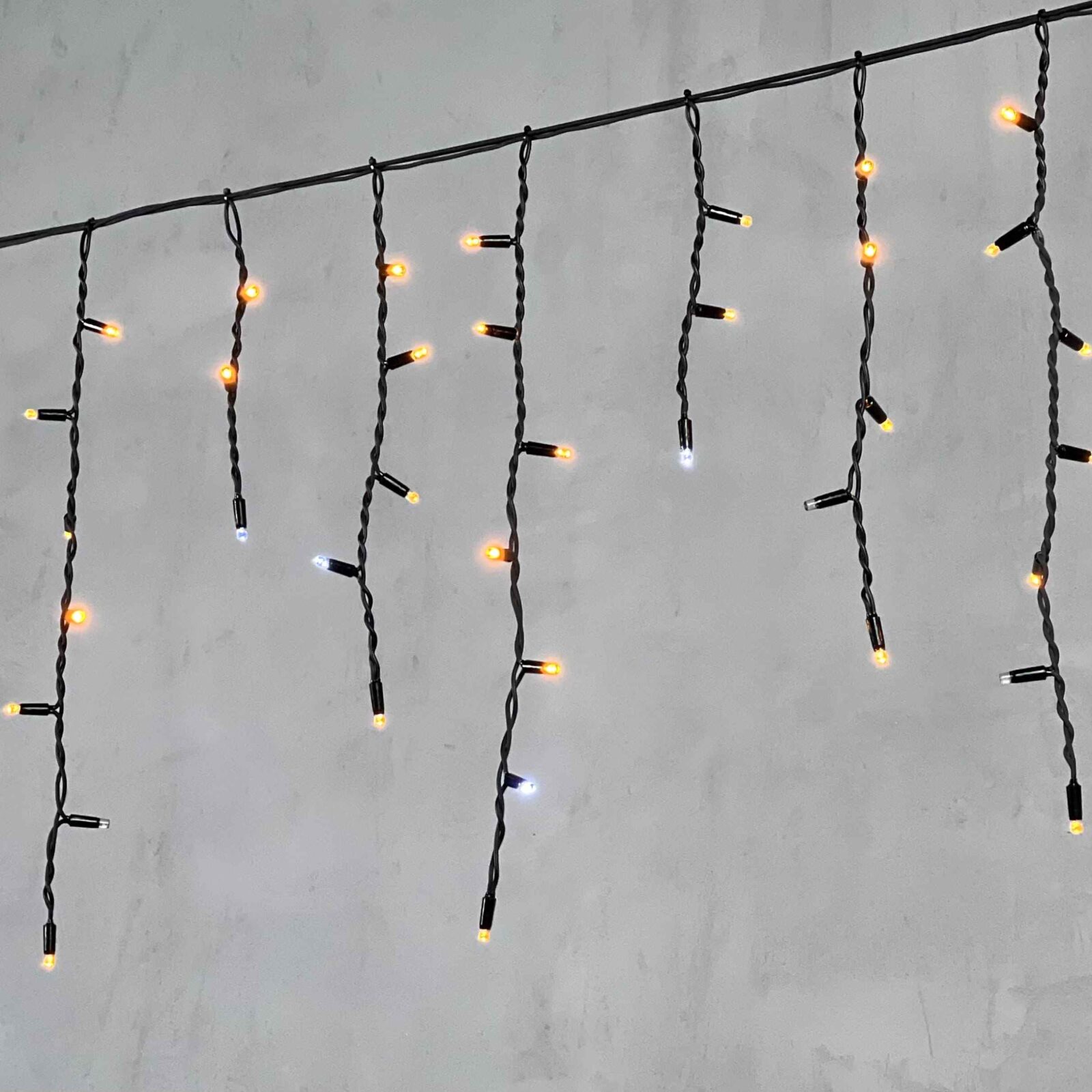 Жёлтая гирлянда бахрома 3,1 м с белыми мерцающими диодами. Прочный чёрный каучуковый провод 3.3 мм, защита IP65. Подходит для фасадов и улицы. Серия PREMIUM PRO.
