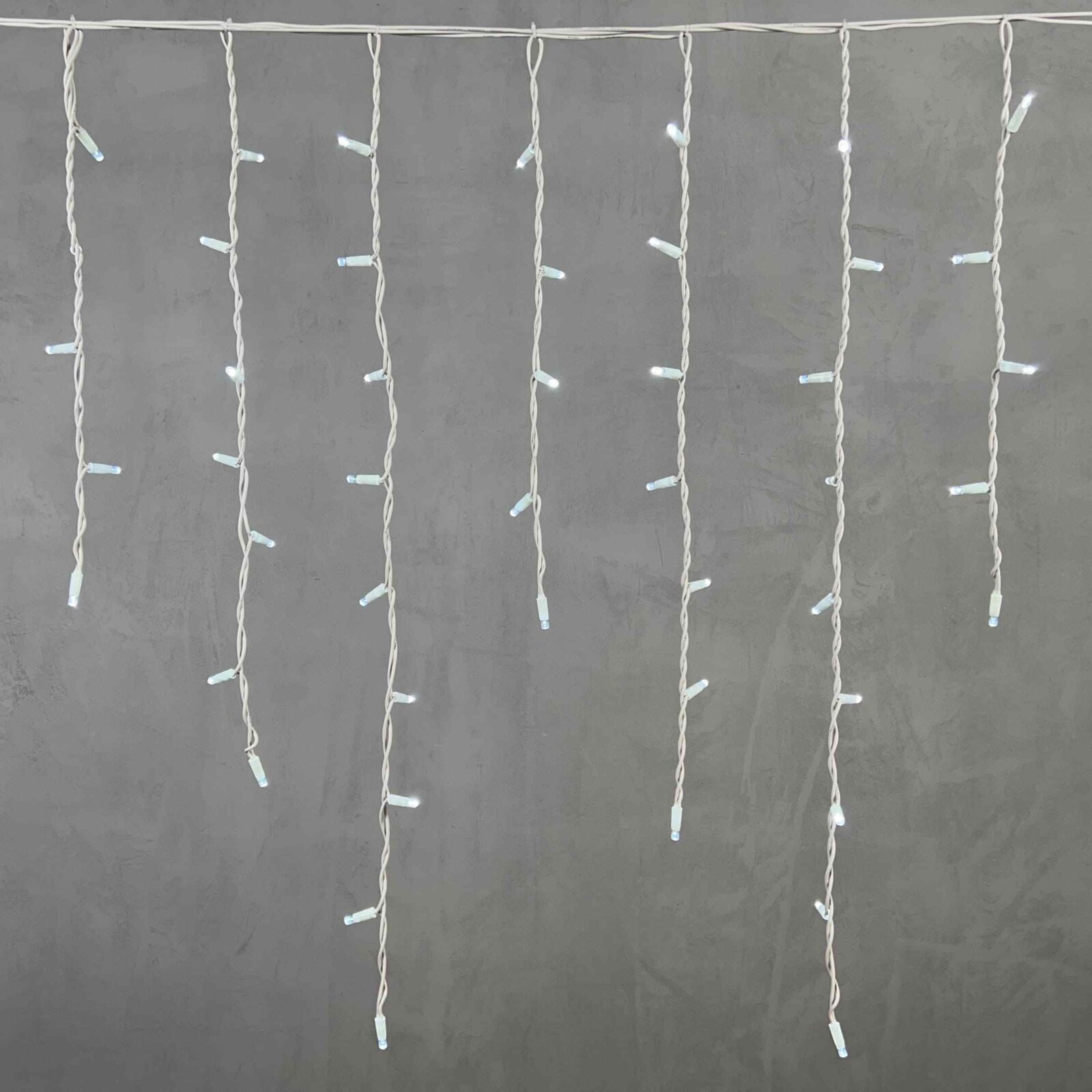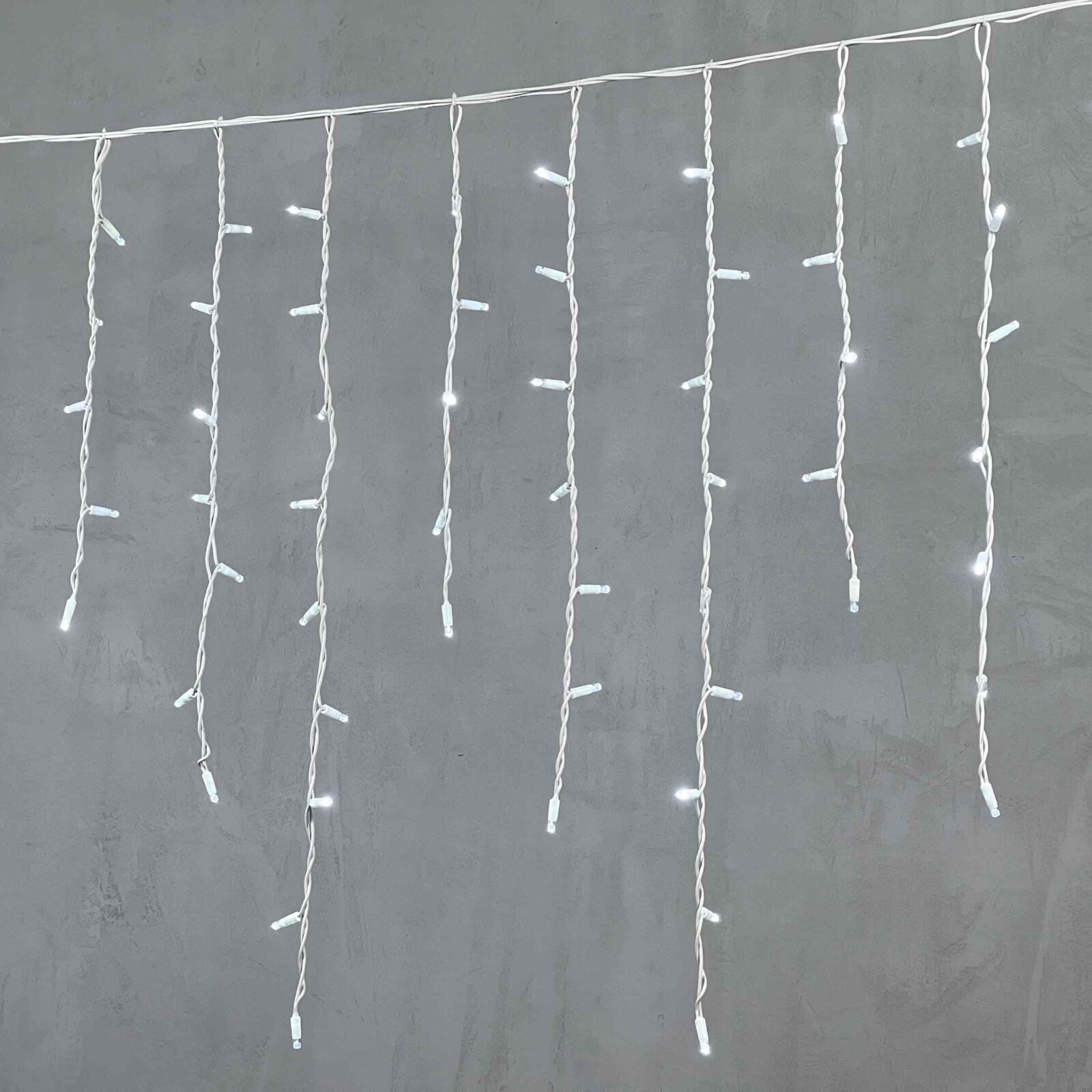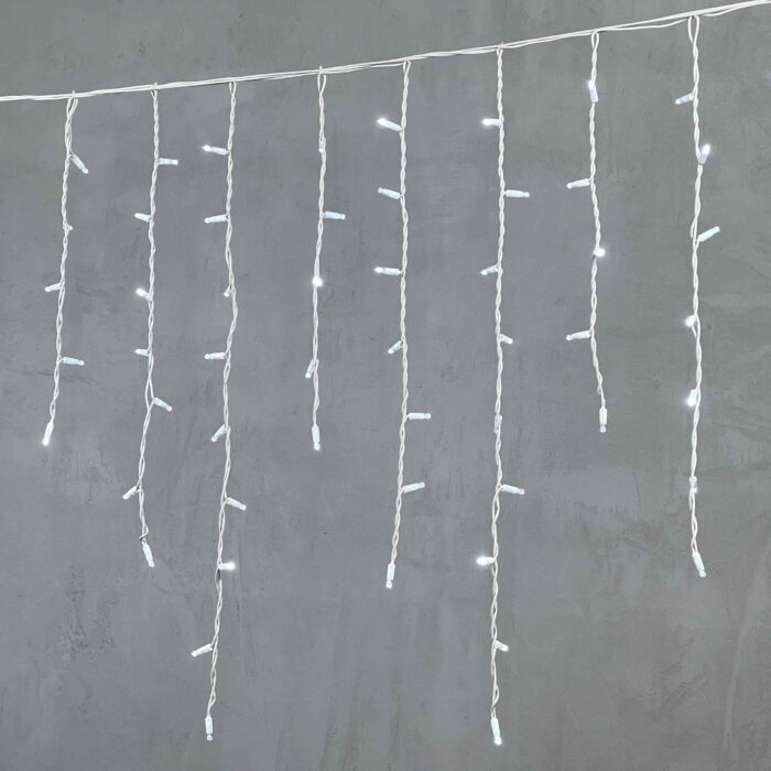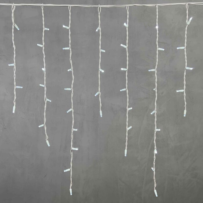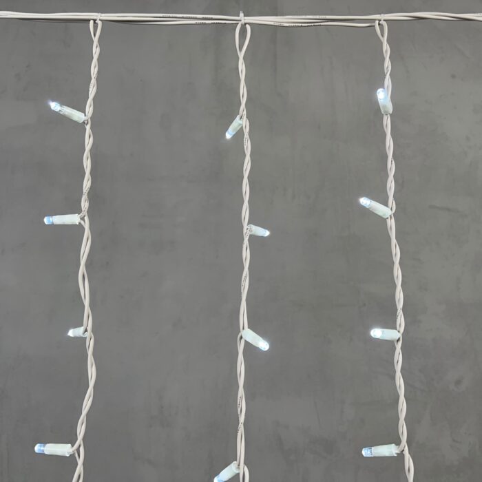Профессиональная гирлянда-бахрома с холодным белым светом, 168 ярких светодиодов, длина 3,2 м. Провод из морозостойкого белого каучука, степень защиты IP65 — надёжна для фасадов частных домов, террас и коммерческих объектов.