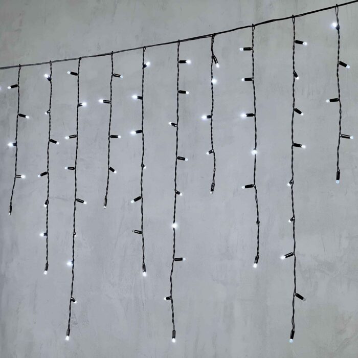 Гирлянда-бахрома LTC 3,2 м с белым свечением и эффектом мерцания белого диода. Провод — чёрный ПВХ. 168 LED, длина свесов до 90 см. Отличный вариант для сезонной подсветки фасадов.