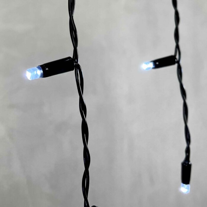 Гирлянда светит ярким белым светом с лёгким мерцанием каждого 7–10 диода. Это не бегущий огонь, а эффект живого свечения — такой тип подсветки особенно популярен в премиальных коттеджах и жилых комплексах. Светодиоды защищены декоративными колпачками, которые усиливают эффект свечения и визуально удлиняют лучи.