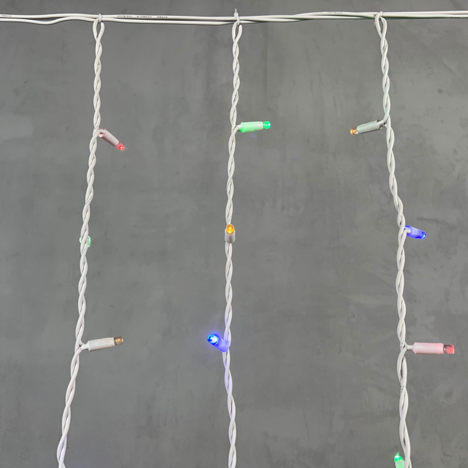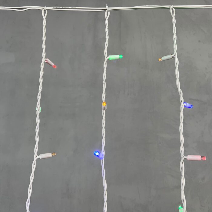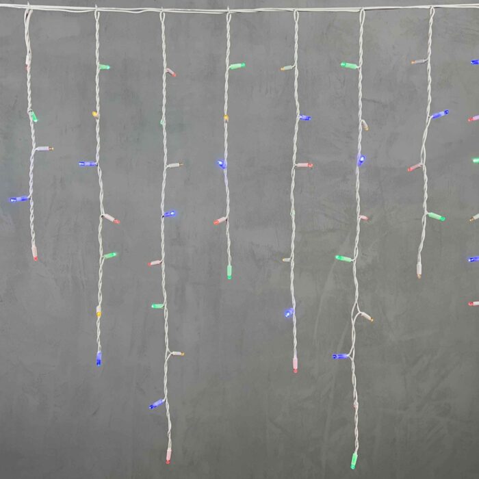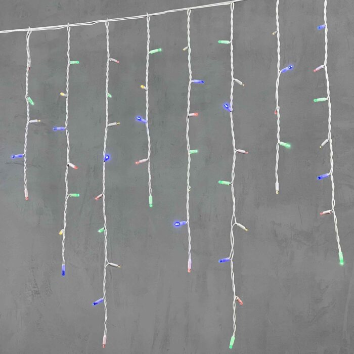 Разноцветная гирлянда-бахрома длиной 3,2 м и высотой 0,9 м с белым морозостойким проводом. Яркие светодиоды (168 шт.), надёжная защита IP65, подходит для улицы. Эффектный выбор для праздничной подсветки дома, кафе или участка. Подключение до 10 штук в линию.