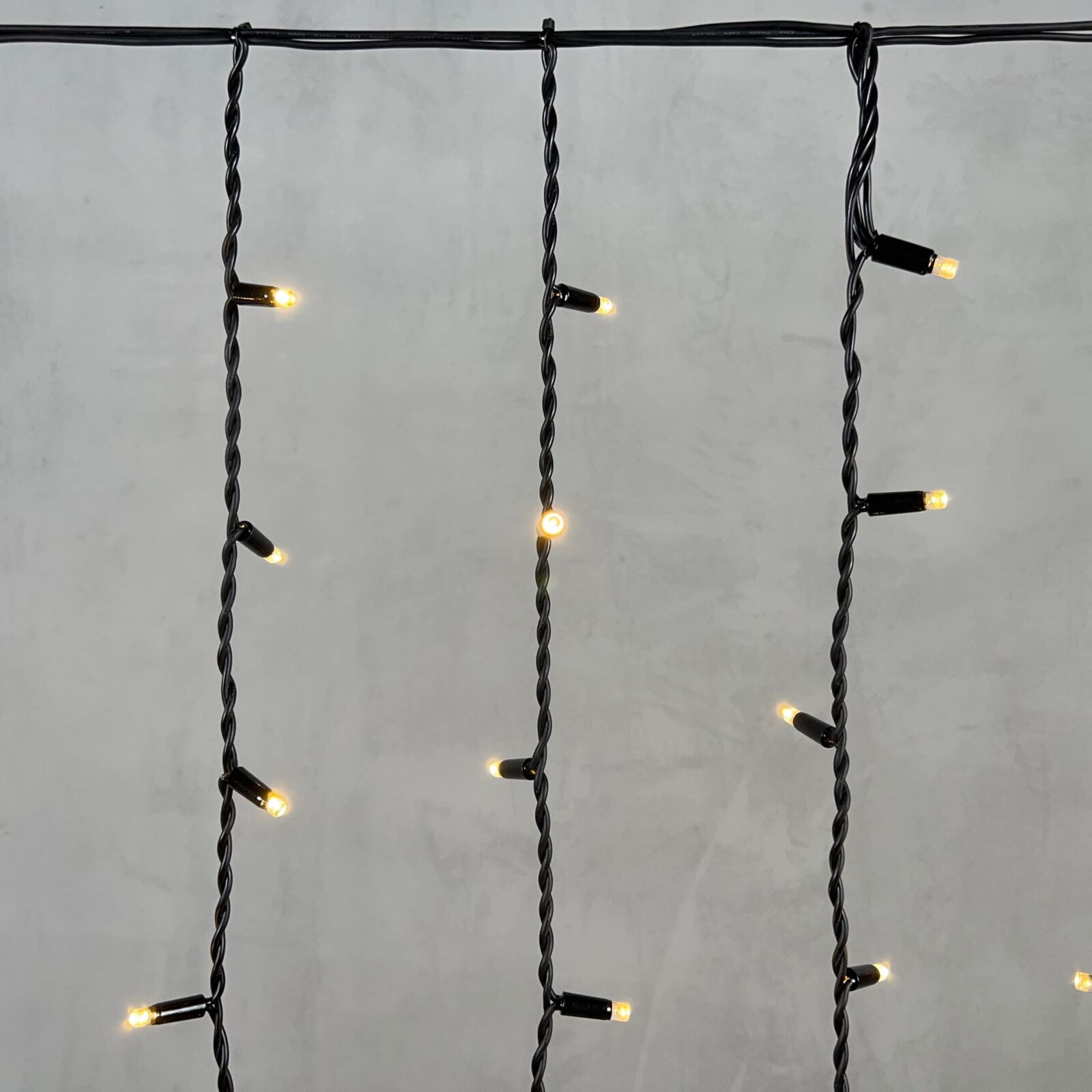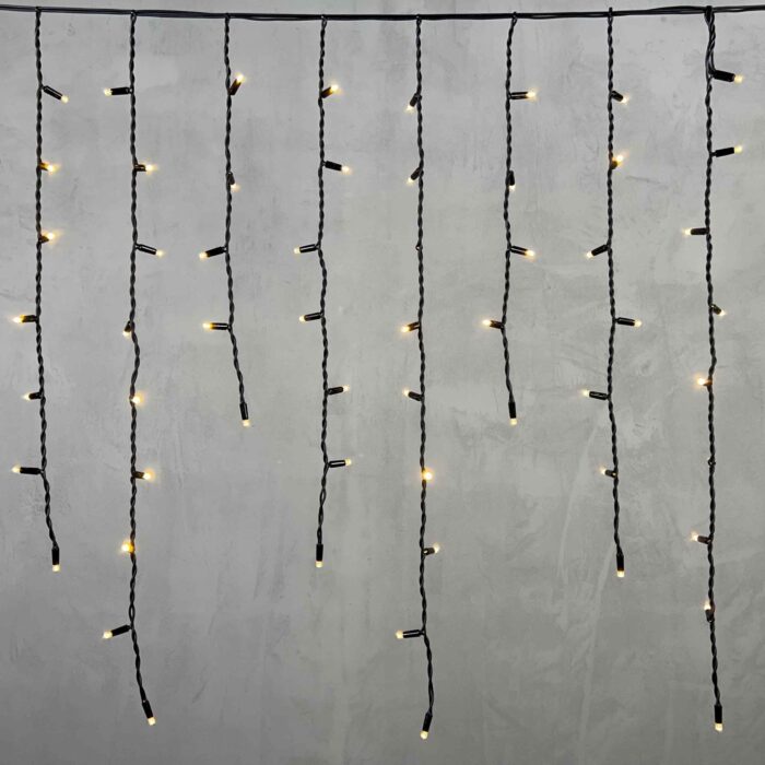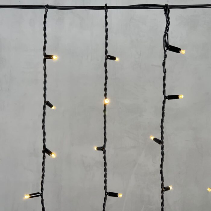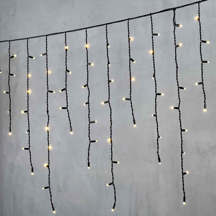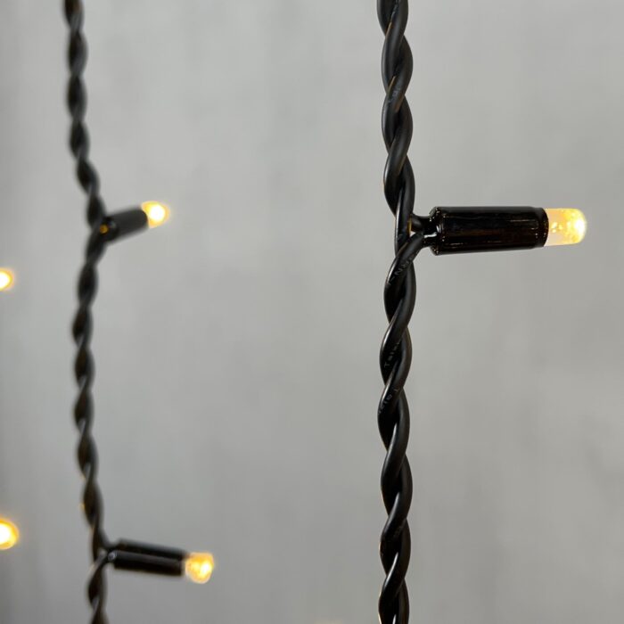 Гирлянда-бахрома длиной 3,2 м с мягким тепло-белым свечением, чёрным морозостойким проводом и надёжной защитой IP65. Профессиональное решение для фасадов частных домов, кафе и загородных резиденций. Подходит для улицы, работает от сети, соединяется в линию до 10 гирлянд.