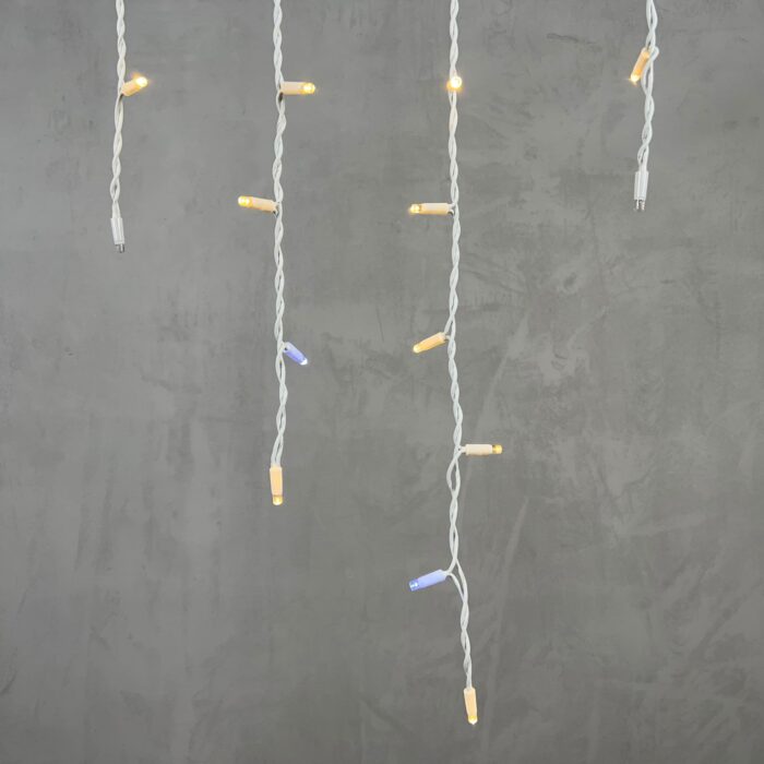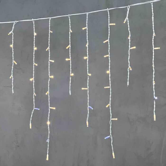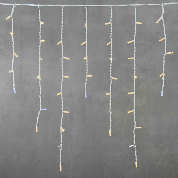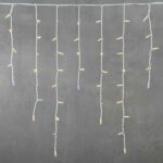 Гирлянда бахрома с тёплым белым свечением и эффектом мерцания. 168 LED, длина 3,2 м, высота 0,9 м. Провод белый, каучуковый, IP65. Идеальна для украшения фасадов, крыш и периметров в частных и коммерческих объектах.