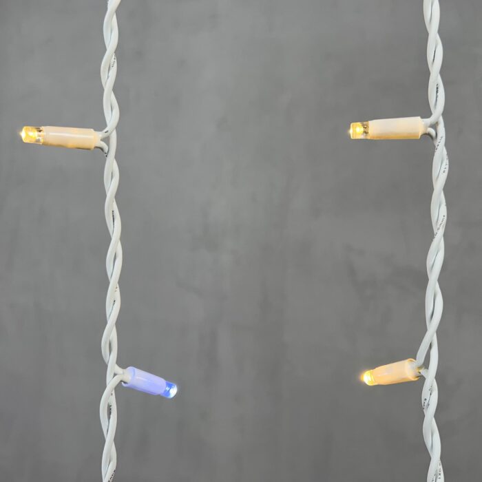 Гирлянда создаёт уютный тёплый белый свет — не холодный и не жёлтый, а именно тот оттенок, который ассоциируется с домашним комфортом и новогодним настроением. Каждое седьмое свечение — мерцающее, благодаря чему создаётся эффект «живого света». Гирлянда выглядит дорого и изысканно как днём, так и вечером.