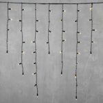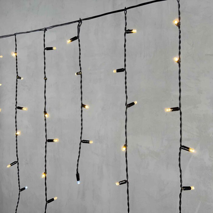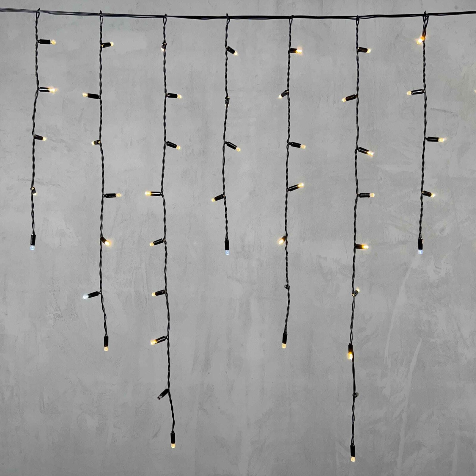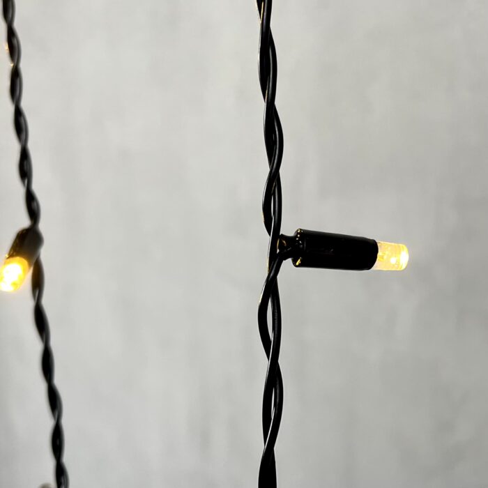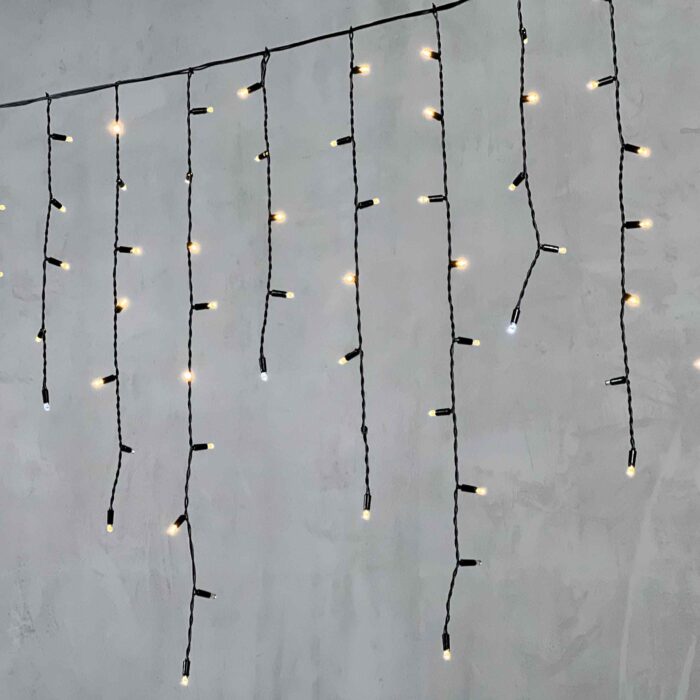 Гирлянда-бахрома LTC длиной 3,2 м с тёплым белым свечением и эффектом мерцания. Провод — чёрный ПВХ. 168 LED. Подходит для фасадов и улицы. IP65, длина свесов — до 90 см.