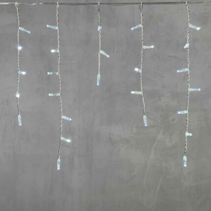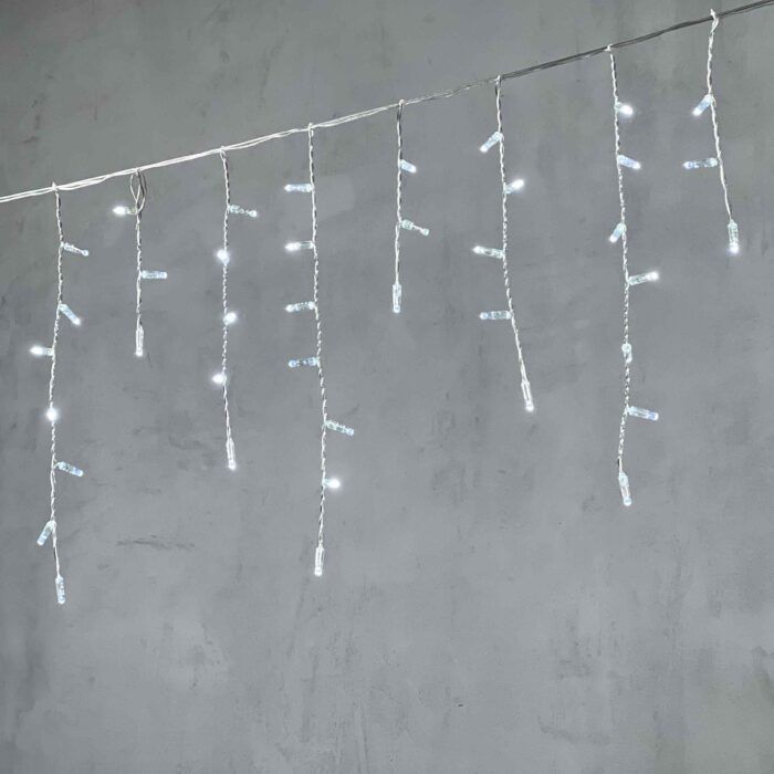 Гирлянда длиной 3,1 м с высотой свесов до 0,5 м — стандарт для карнизов, фасадных пролётов и входных групп. Внутри — 120 LED с плотным расположением. Нити образуют ровную бахрому, без пропусков и тёмных участков. Шаг — оптимальный, чтобы создавать равномерную линию света.