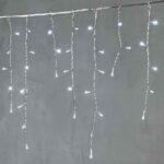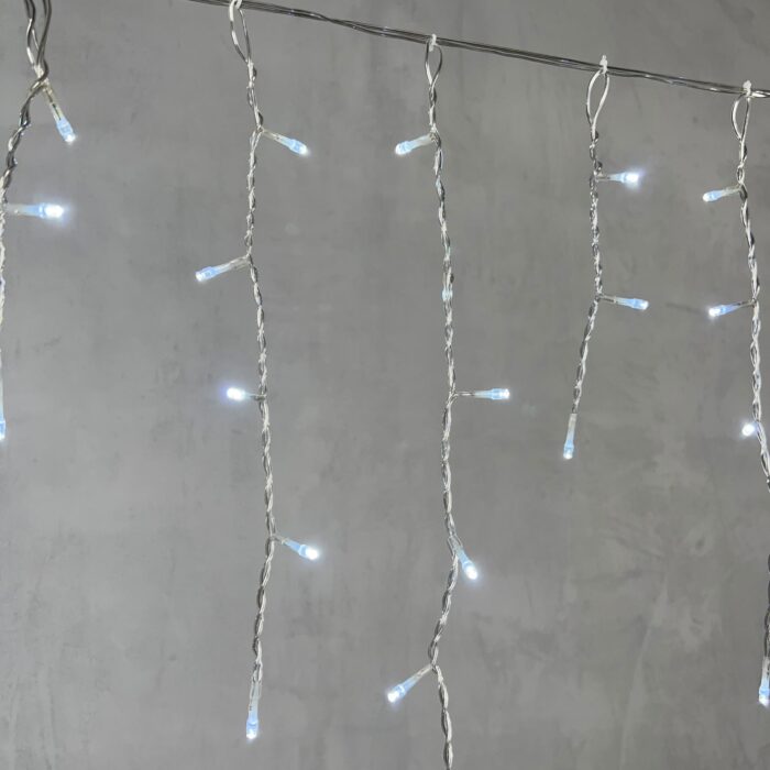 Белая гирлянда-бахрома длиной 3,1 м с прозрачным проводом и 150 светодиодами. Даёт ровное холодное свечение, идеально подчёркивающее линии фасада. Оснащена защитой IP54 и подходит для сезонного оформления улицы. Соединяется в цепь до 10 штук, подключение в комплекте.