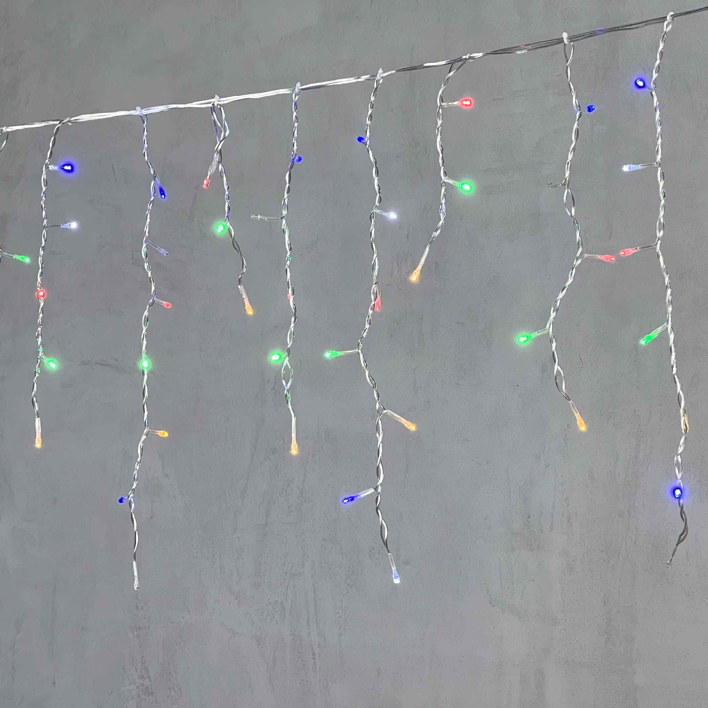 Яркая гирлянда-бахрома 3,1 м с разноцветными диодами и белым мерцанием. 150 LED, прозрачный ПВХ-провод, IP54, питание от 220 В. Подходит для уличного декора фасадов, навесов, перил. Соединяется в цепь до 10 гирлянд. Подключение в комплекте.