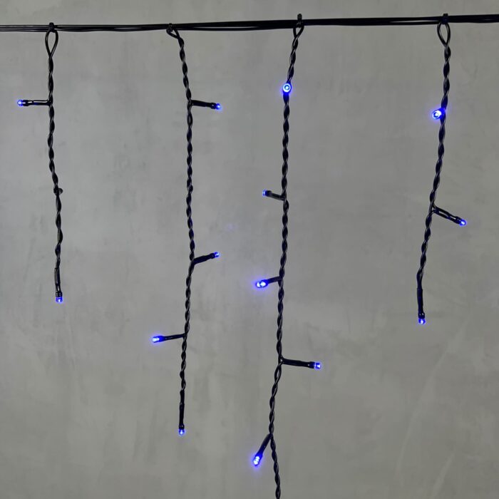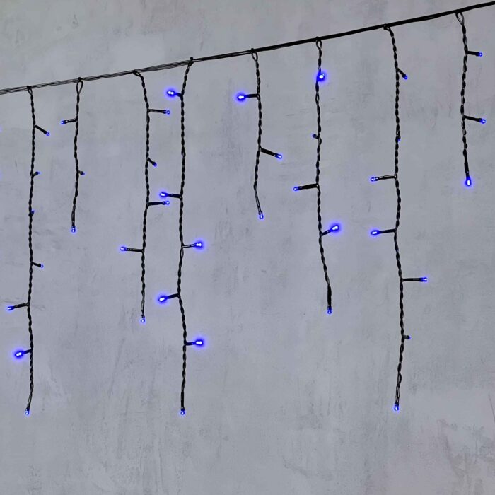 Синяя гирлянда-бахрома длиной 3,1 м — эффектное решение для фасадов, заборов и входных групп. 150 диодов, статичное свечение, защита IP54, прочный чёрный ПВХ-провод. Подходит для улицы, работает при морозе до −30 °C. Компактная, надёжная и атмосферная.