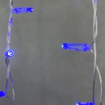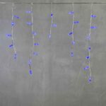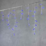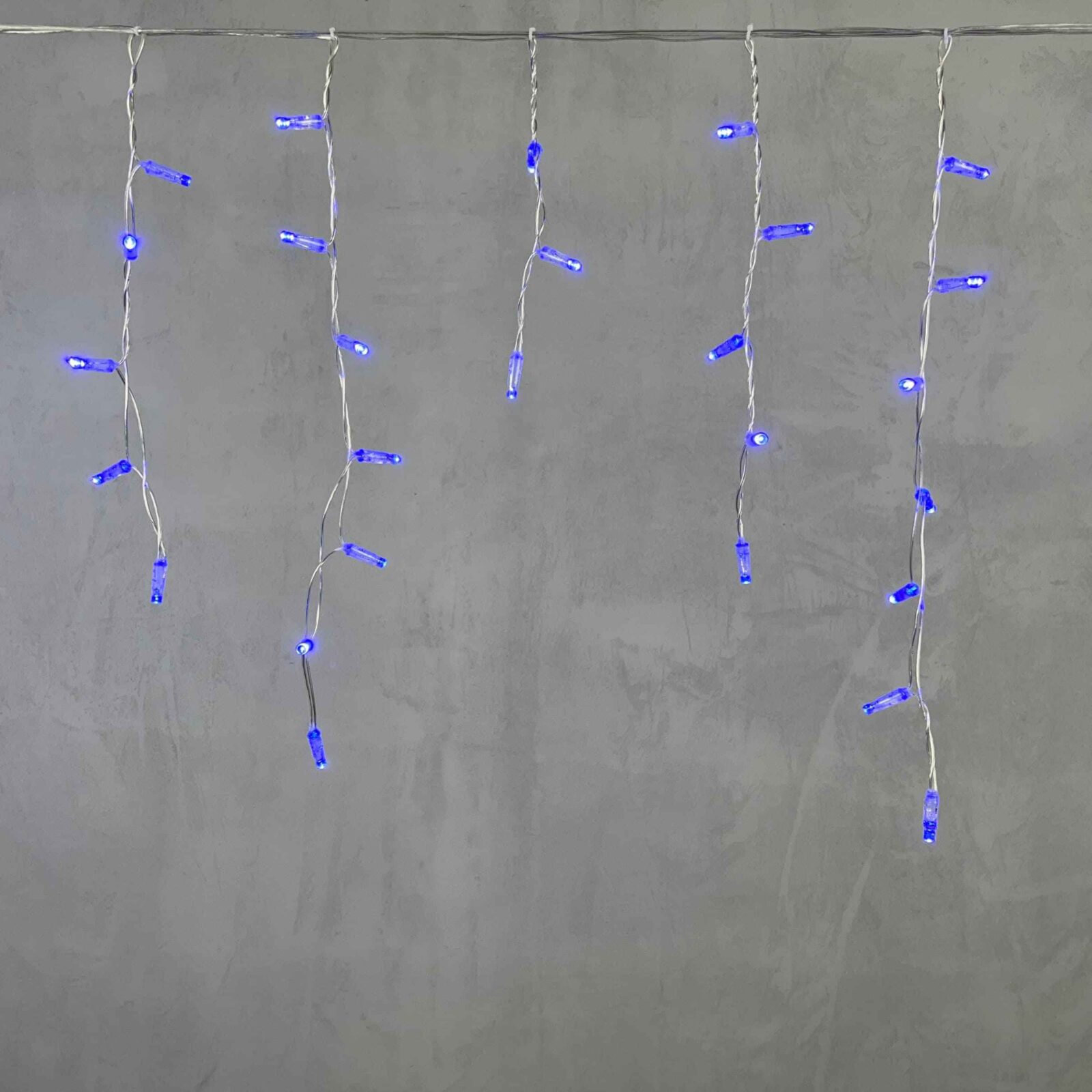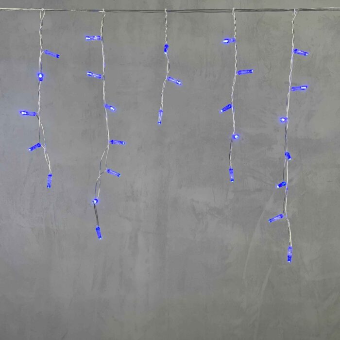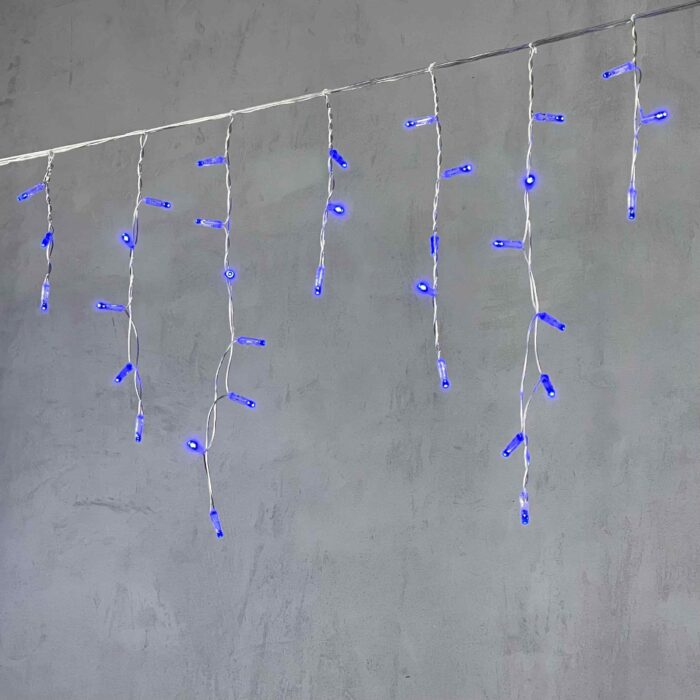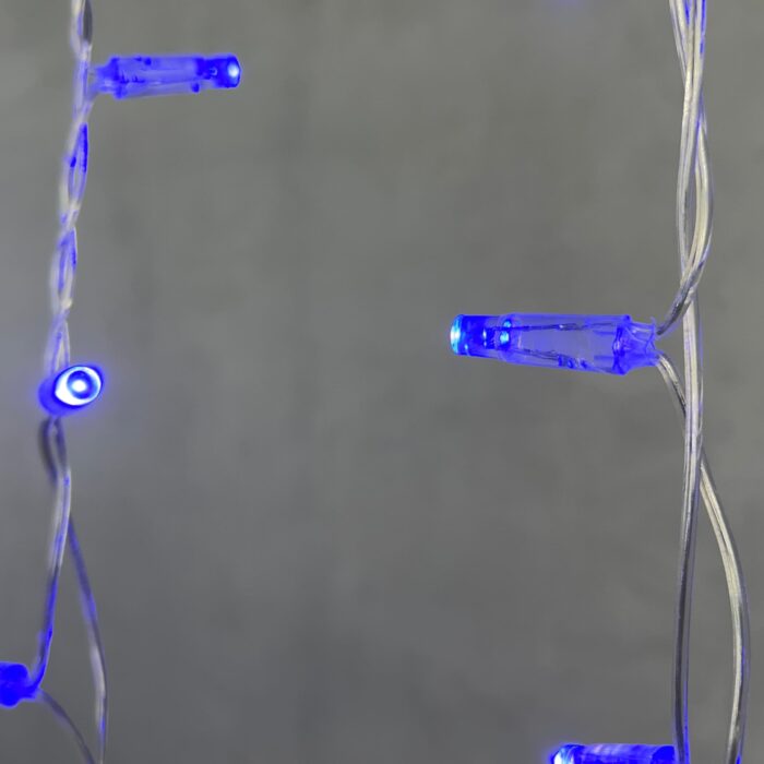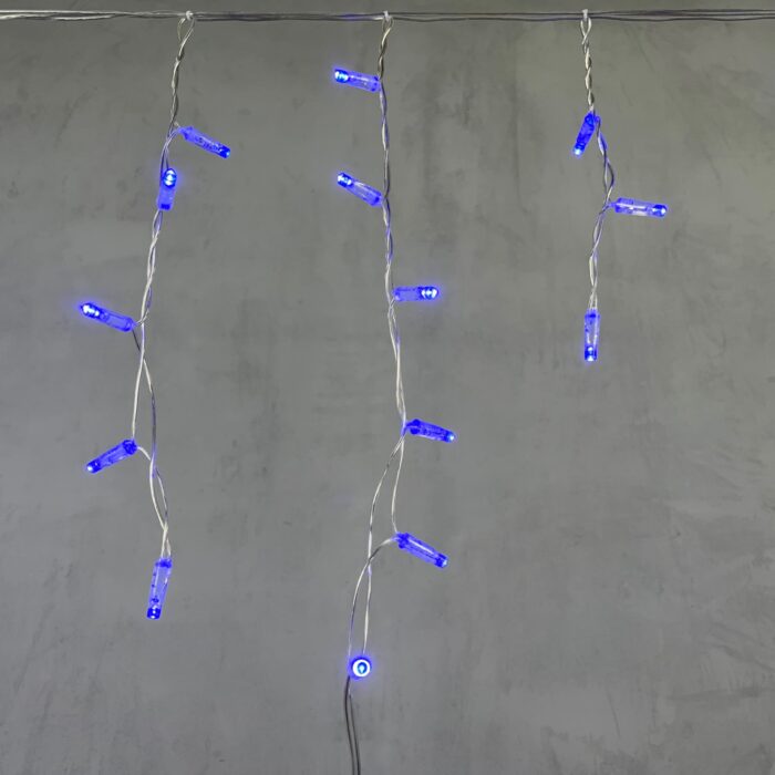 Яркая гирлянда бахрома с насыщенно-синим светом. 120 диодов, 3,1 м длина, высота — 0,5 м. Прозрачный ПВХ-провод. IP65 — надёжная защита от воды и пыли. Подходит для улицы. Выглядит эффектно на фасаде, особенно зимой. Можно соединять до 10 гирлянд в линию.