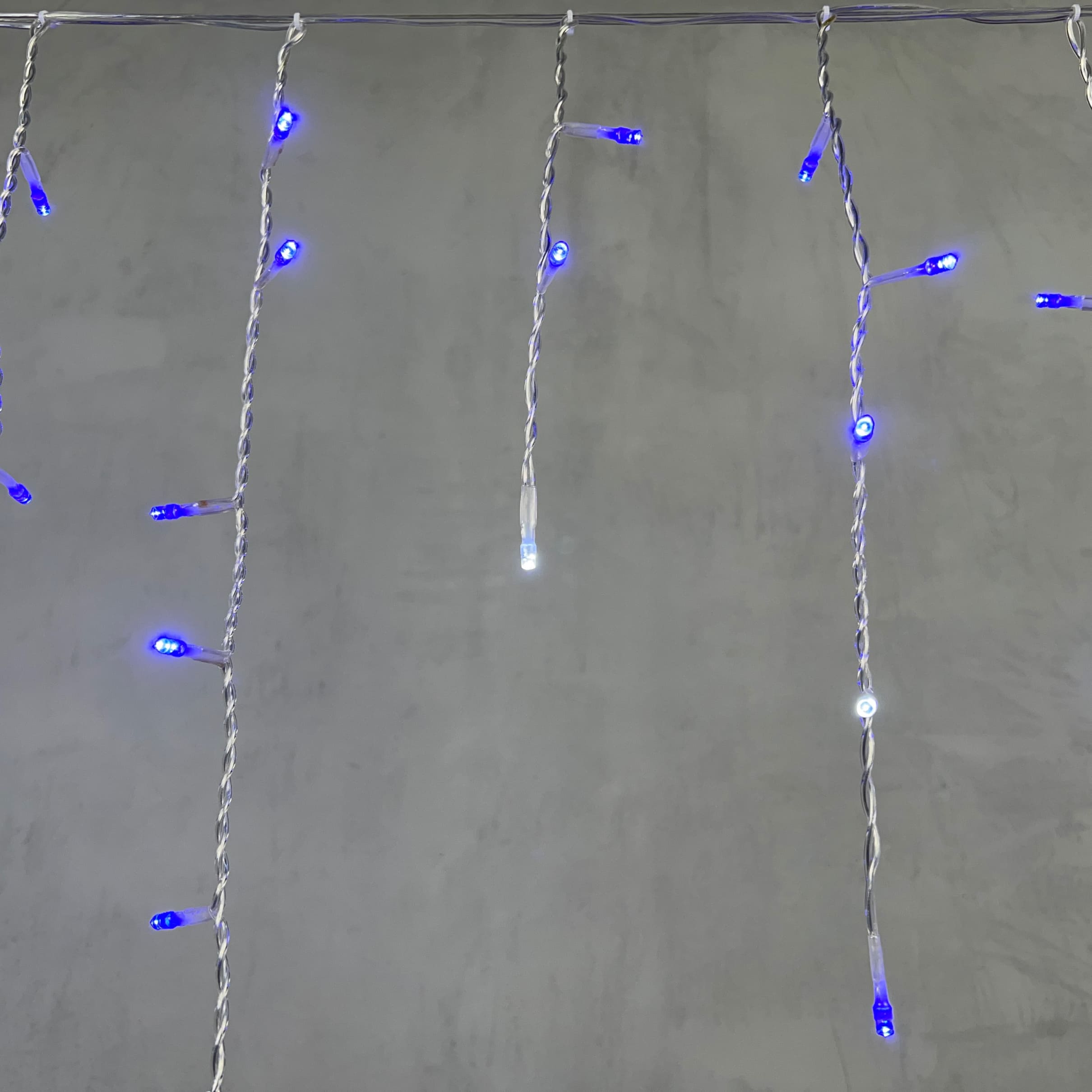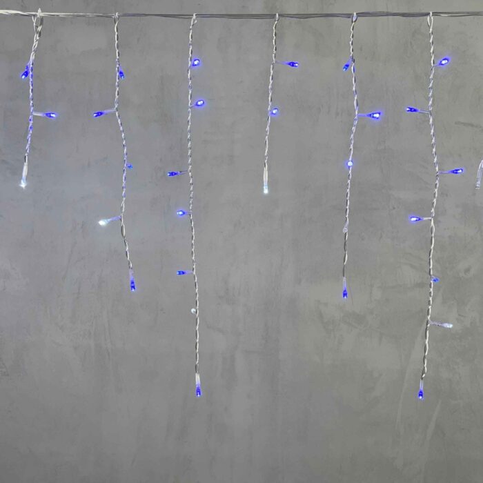 Синяя гирлянда-бахрома 3,1 м с белыми мерцающими светодиодами. 150 LED, прозрачный ПВХ-провод, защита IP54, питание от сети 220 В. Отлично подходит для оформления фасадов, крыш, террас. Соединяется до 10 гирлянд в линию. Подключение в комплекте.