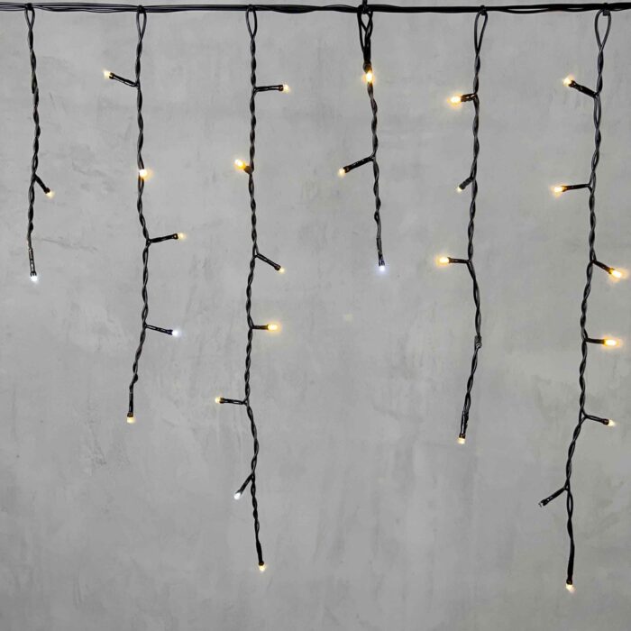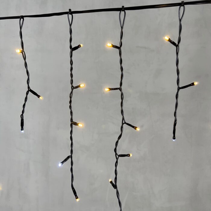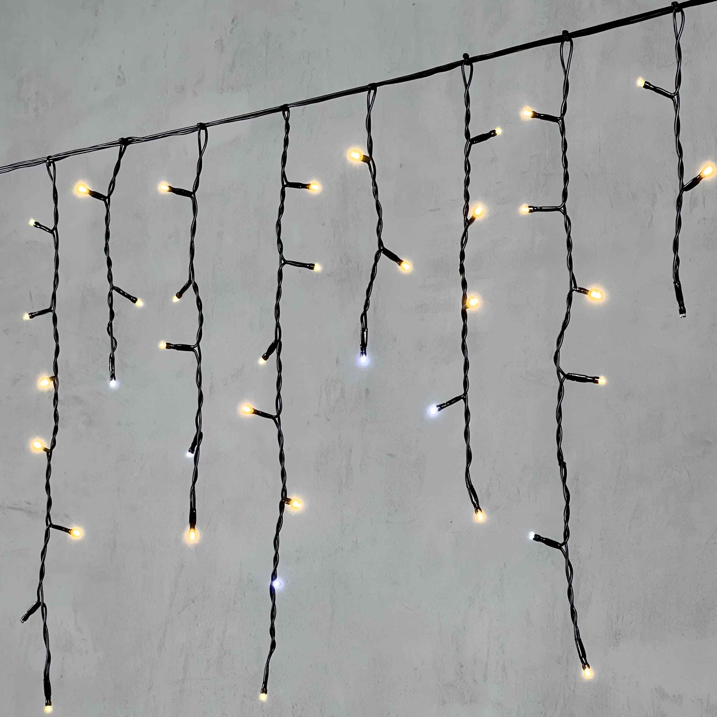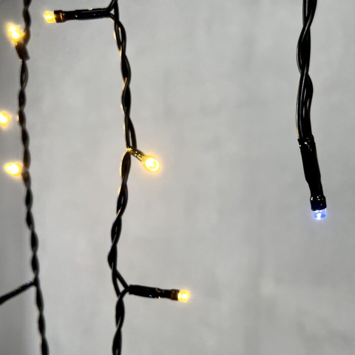 Эффектная бахрома с мягким тёпло-белым свечением и лёгким мерцанием. Длина 3,1 м, 150 светодиодов, чёрный ПВХ-провод, IP54. Готова к подключению, можно соединять до 10 гирлянд подряд. Отлично подходит для фасадов, крыш и навесов.