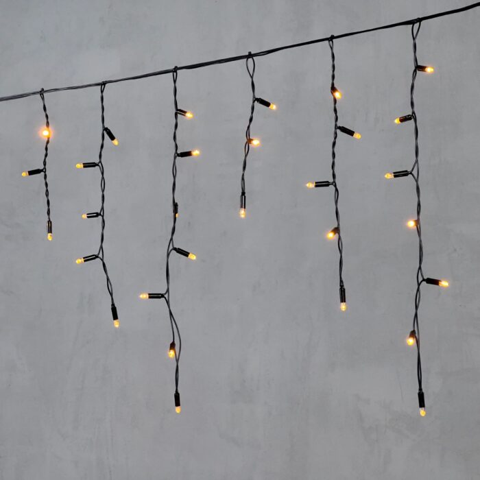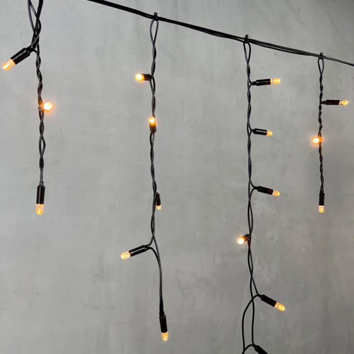 Гирлянда бахрома с колпачками и экстра тёплым свечением для уличного оформления. Чёрный ПВХ-провод — практичный и малозаметный. 120 LED, длина 3,1 м, высота свесов — 0,5 м. Свет мягкий, ровный, с акцентом на уют и атмосферу. IP65, морозостойкость до −30 °C. Надёжное решение для фасадов и входных групп.