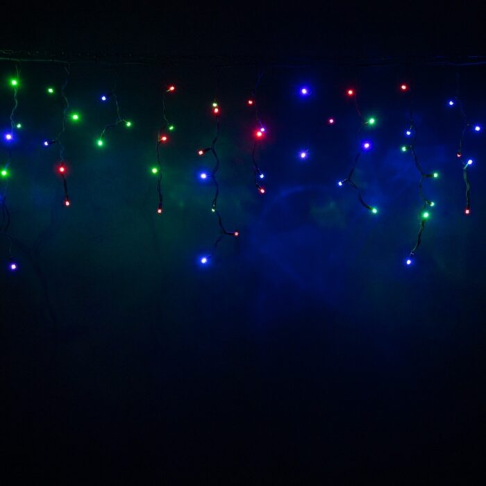 Яркая цветная гирлянда-бахрома длиной 3 м с эффектом мигания. Провод — чёрный каучук 3.3 мм, защита IP65. Универсальна: для улицы и помещений, ёлок, фасадов, перил. Поставляется с подключением.