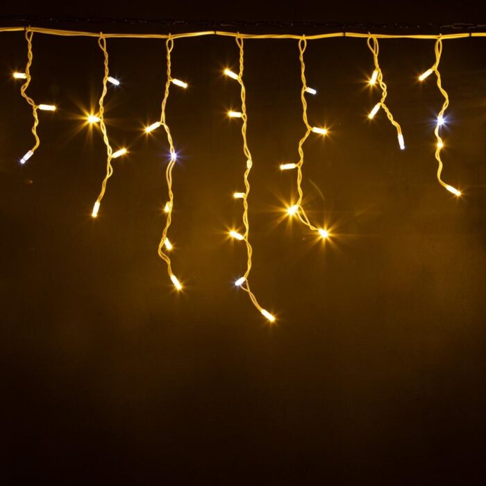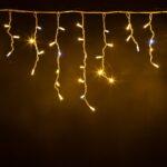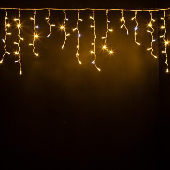 Уличная гирлянда-бахрома длиной 3 м с тёплым белым свечением и эффектом мерцания. 100 LED, белый каучук 3,3 мм, IP65, соединение до 10 шт. Подходит для фасадов, ёлок, деревьев и перил.