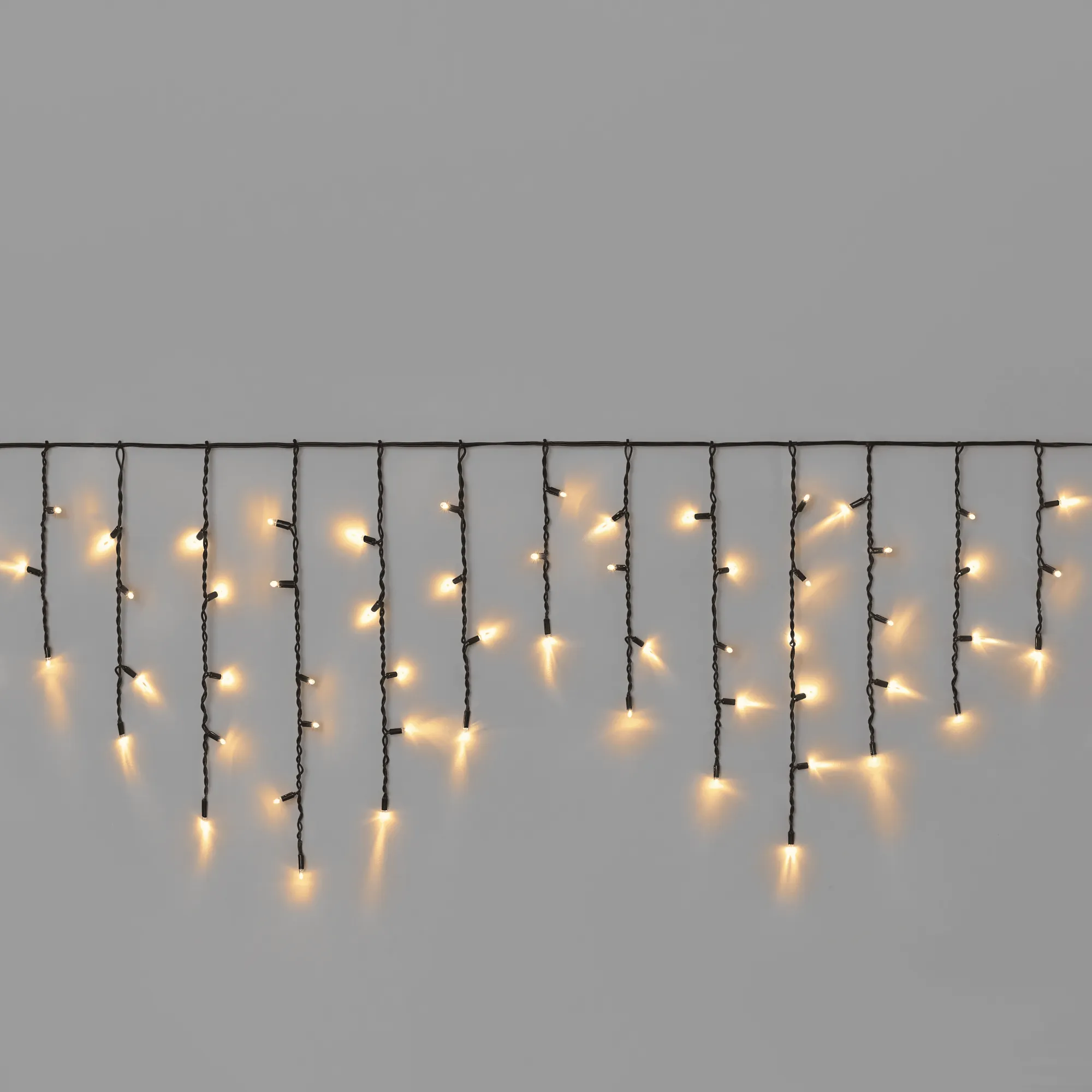 Профессиональная гирлянда бахрома 3 м с тёплым белым свечением. Идеальна для оформления фасадов, заборов и перил. Устойчива к морозу и осадкам. Черный каучуковый провод, 108 LED, IP65.