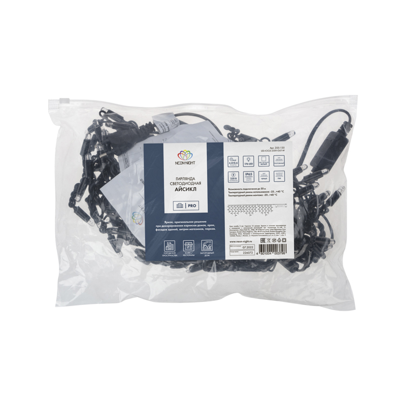 176 светодиодов размещены на 48 нитях разной длины. Такое расположение обеспечивает равномерное свечение без тёмных зон. Свет мягкий, не мерцает, не режет глаза. Высота бахромы — 0,6 м, что позволяет использовать гирлянду и на низких карнизах, и на высоких фасадах.