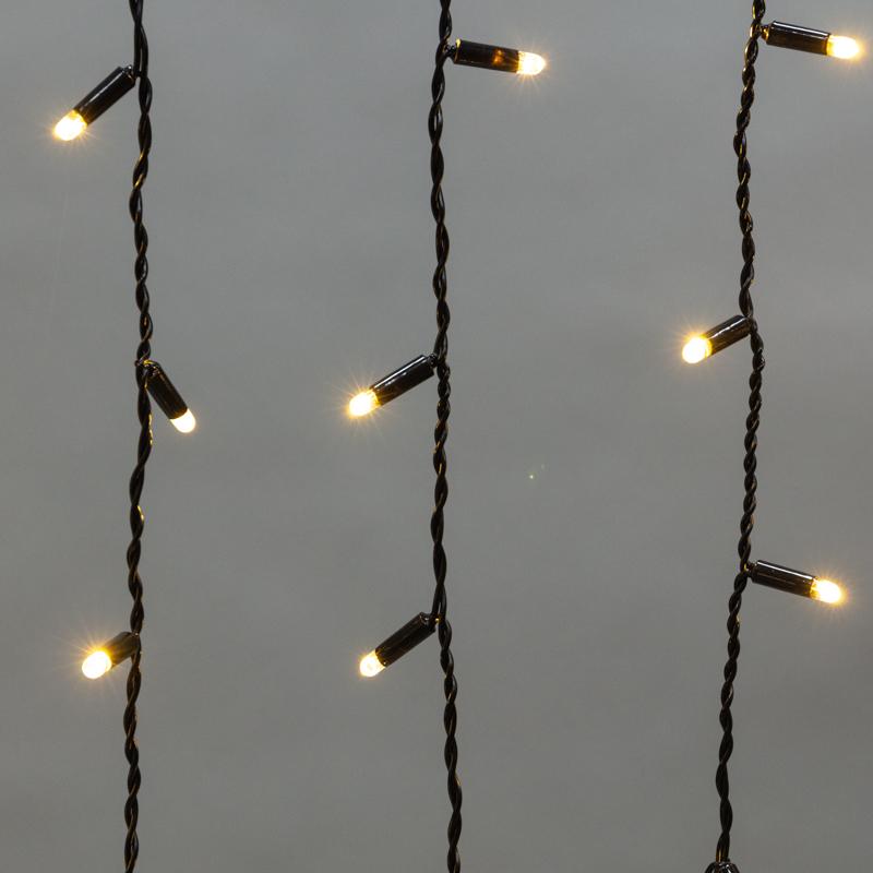 Тёплая гирлянда-бахрома 4,8 м с 176 светодиодами. Универсальный формат, IP65, чёрный ПВХ-провод. Подходит для улицы и дома. Надёжная, сочетается с любым фасадом.