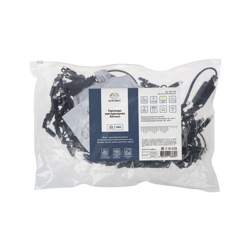 Длина гирлянды — 4,8 метра. В составе — 176 ярких диодов, равномерно размещённых на 48 вертикальных нитях. Высота 0,6 м оптимальна для подсветки карнизов, крыш, навесов и входных зон. Свет — статичный, без мерцания. Он создаёт ровный, мягкий визуальный эффект.