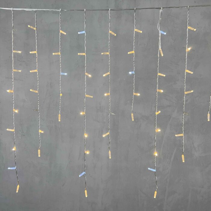 Гирлянда бахрома длиной 4,9 м с колпачками и тёплым белым светом. 273 диода, эффект мягкого мерцания, защита IP65. Уличное применение. Прозрачный провод ПВХ — почти невидим на фасаде. Подключение приобретается отдельно.