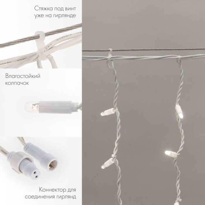 Провод выполнен из белого каучука толщиной 3,3 мм — это материал профессионального уровня, который устойчив к морозу, влаге, ультрафиолету и механическим нагрузкам. Белый цвет незаметен на светлом фасаде, что особенно актуально при дневном освещении — гирлянда остаётся визуально чистой и ненавязчивой.