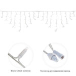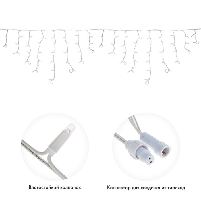 Гирлянда подключается к сети 230 В (сетевой шнур приобретается отдельно). Поддерживается соединение до 15 гирлянд в одну линию — удобно для подсветки длинных фасадов и заборов. Разъёмы герметичны, обеспечивают стабильную и безопасную работу всей цепи.