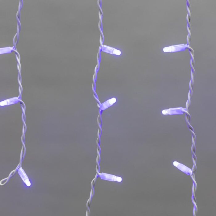 Надёжная уличная гирлянда бахрома 4×0,6 м с насыщенным синим светом и статичным свечением. Белый прочный каучуковый провод 2,3 мм, 128 светодиодов, питание от сети 230 В. Класс защиты IP67. Идеальна для фасадов, крыш и ограждений.