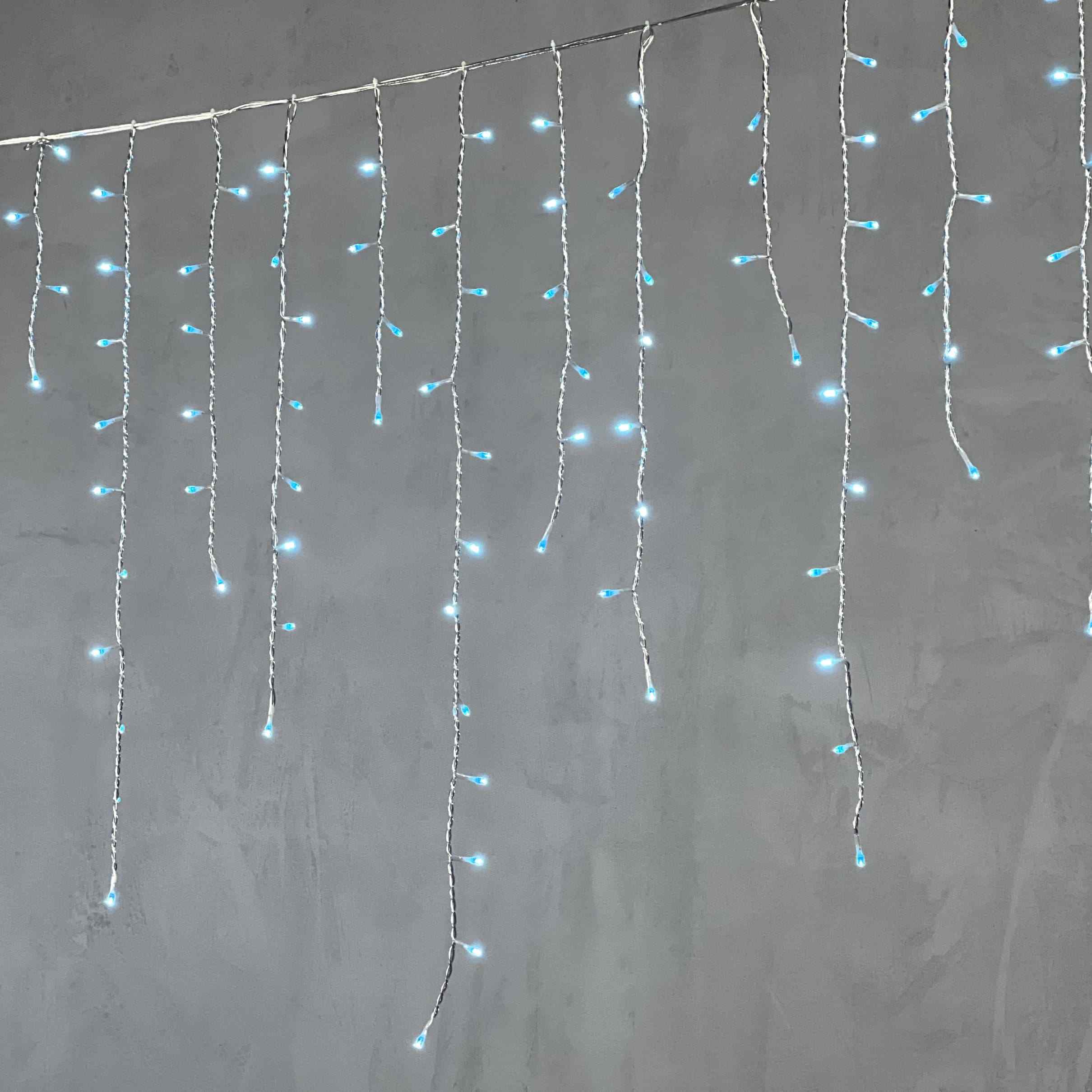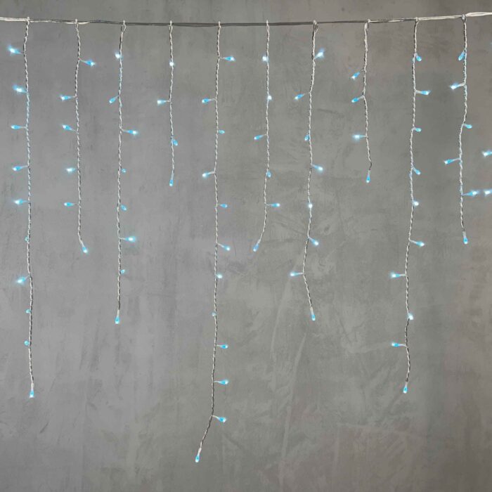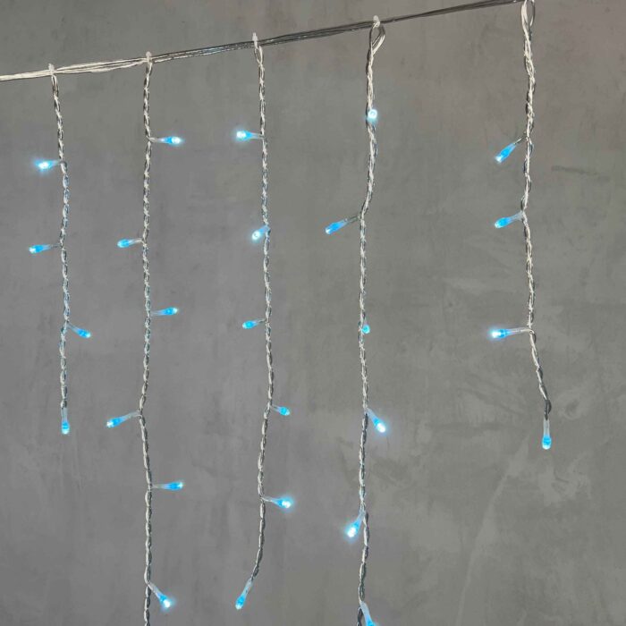 Уличная гирлянда-бахрома 5 метров с мягким небесно-голубым светом. 348 LED, прозрачный силиконовый провод, защита IP65. Подходит для фасадов, карнизов и новогоднего декора.