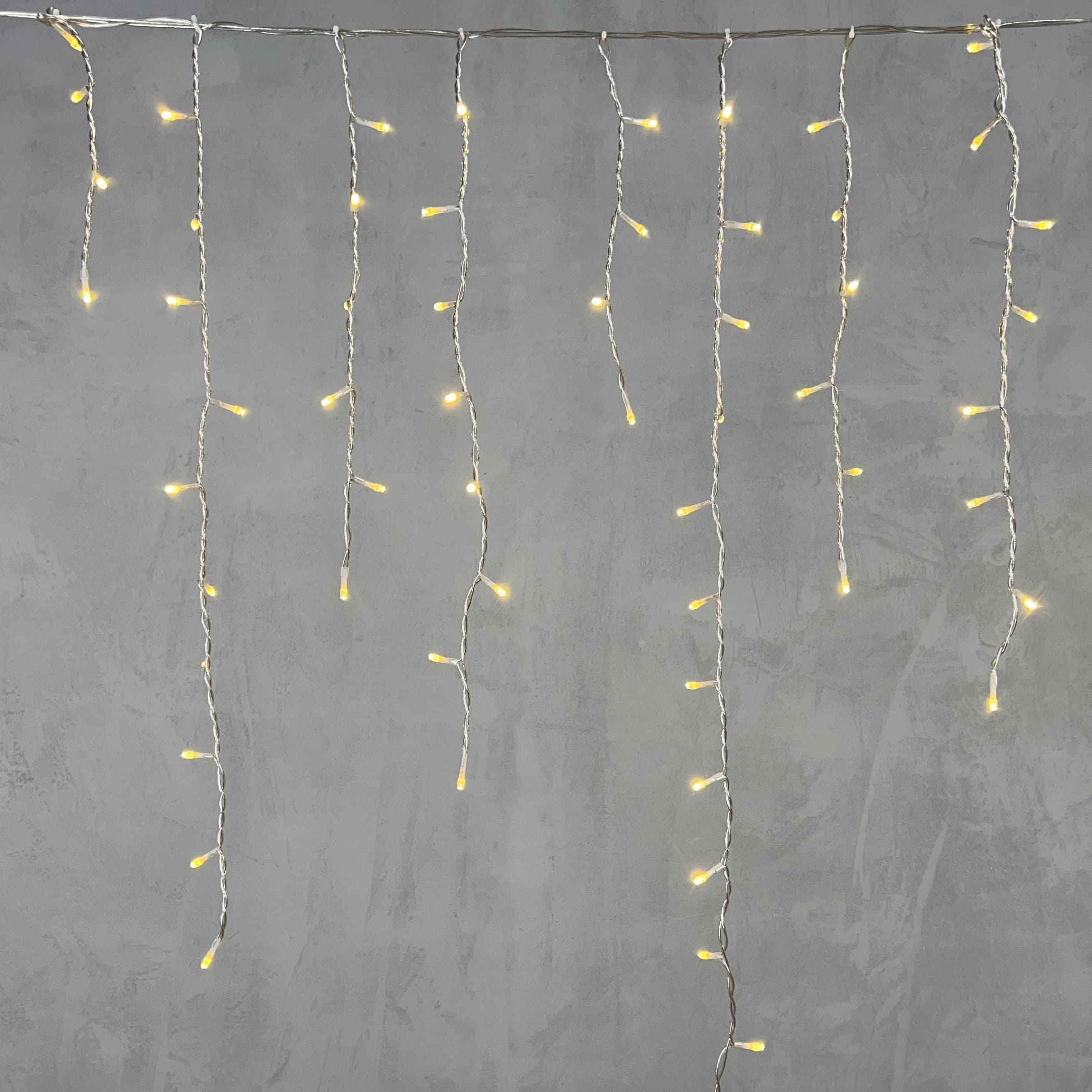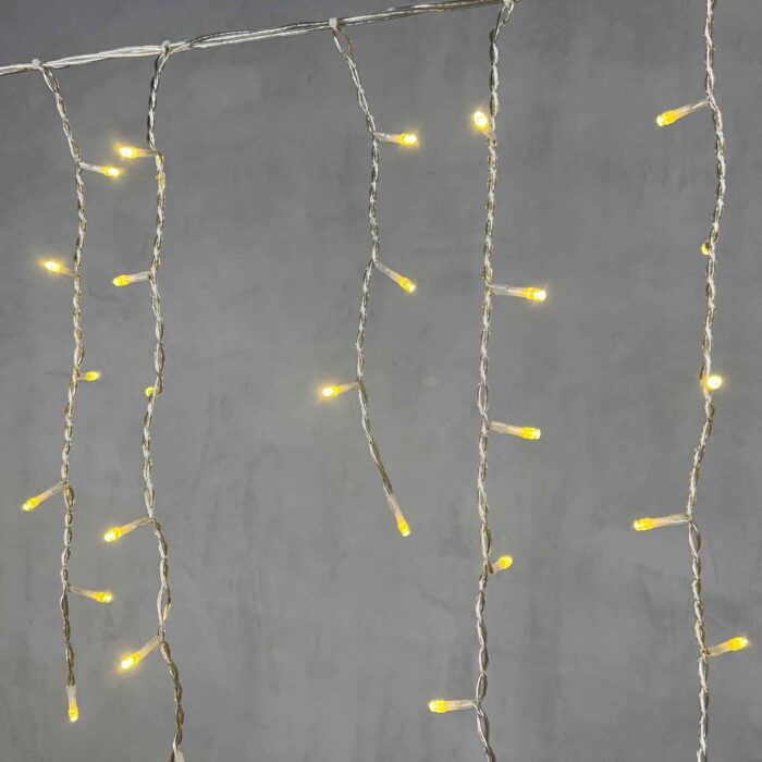 Праздничная гирлянда-бахрома 5 метров, цвет свечения — шампань. 348 ярких LED, прозрачный силиконовый провод, защита IP65. Подходит для улицы и фасадов частных домов.