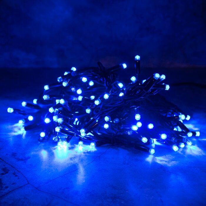 Каждый седьмой светодиод мигает — создаётся лёгкий, ненавязчивый эффект «живого света». В темноте это привлекает внимание, но не утомляет взгляд. Синие мерцающие гирлянды часто используют в премиум-посёлках, на объектах со стеклянными навесами, резиденциях и бутиках.
