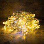 На 5 метрах расположено 150 диодов, распределённых по нескольким десяткам лучей длиной от 30 до 70 см. Такая плотность обеспечит равномерное свечение без «провалов» и тени. Диоды не просто «точки света», а яркие и надёжные элементы, рассчитанные на ~30 000 часов работы. Цвет свечения — тёплый белый (≈2700–3000К): создаёт уют и праздничное настроение, не искажает цвета.