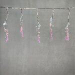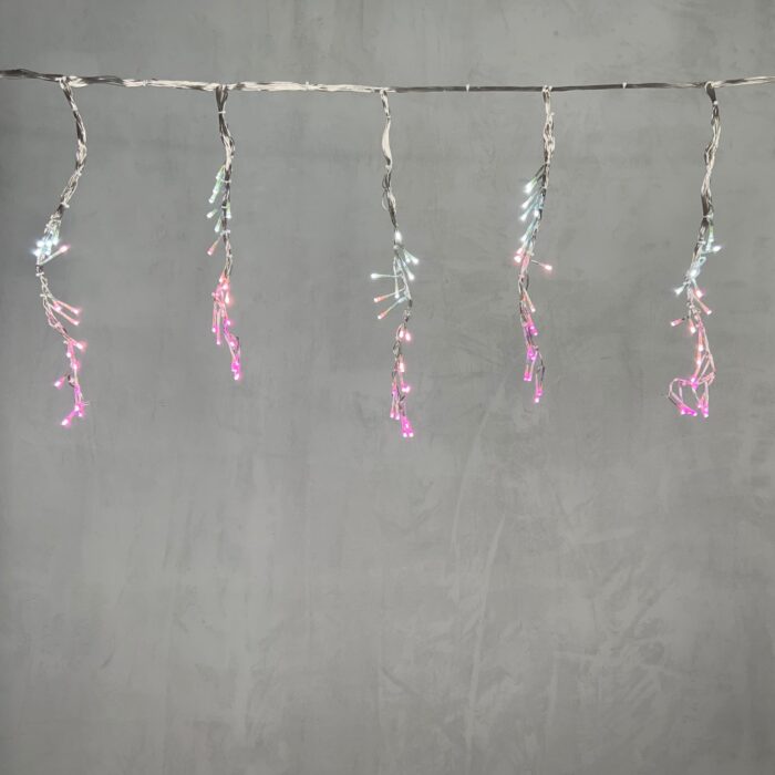 Уличная гирлянда-бахрома с эффектом бегущего огня, 1,75 м длиной и 0,4 м высотой. 320 бело-розовых светодиодов, 8 режимов свечения, безопасное питание 24 В, защита IP65, прозрачный силиконовый провод. Готова к подключению.