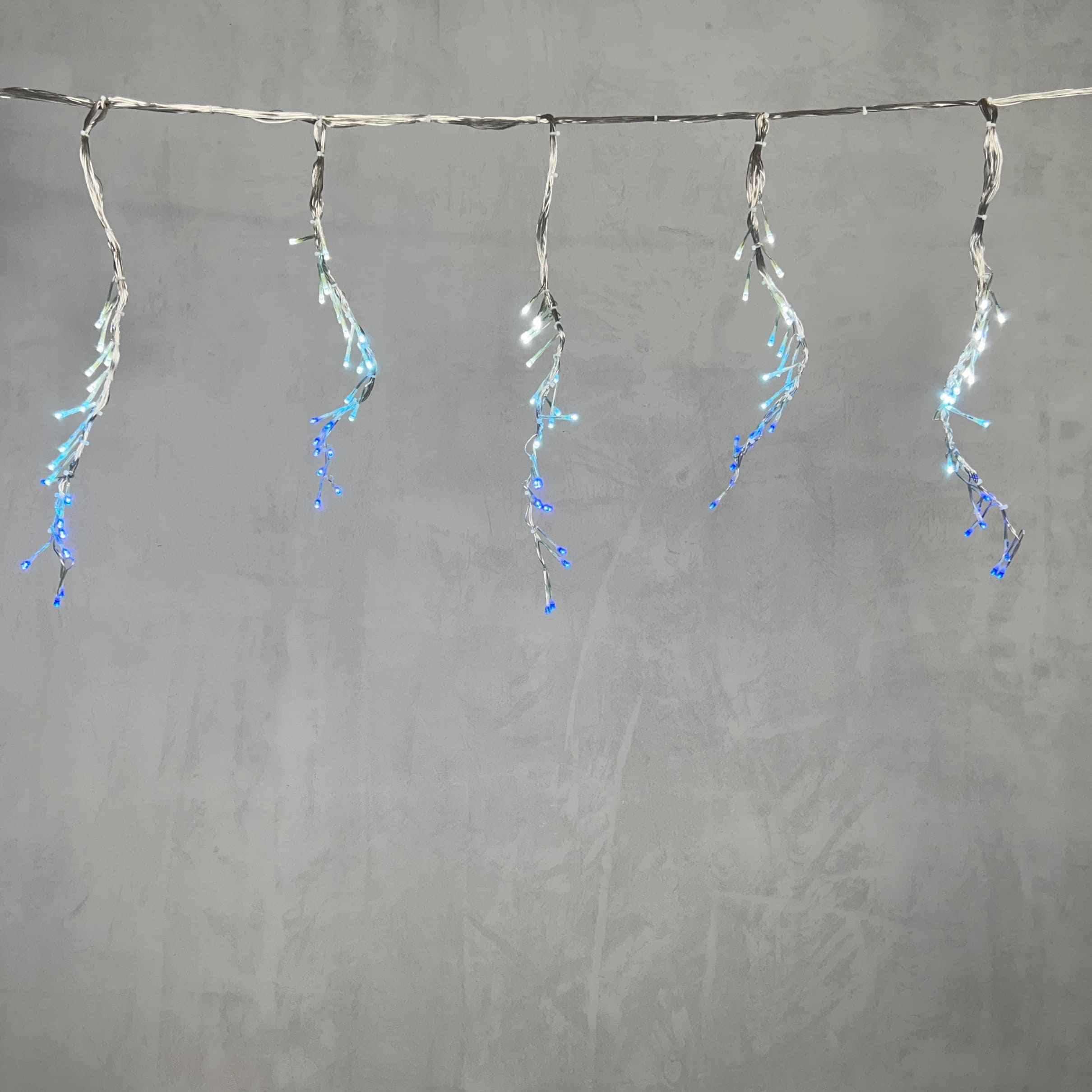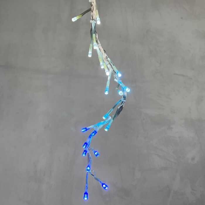 Бело-синяя бахрома с эффектом «бегущий огонь» — это эффектное решение для оформления фасадов, входных групп, витрин, беседок и праздничных пространств. Контраст холодного синего и нейтрального белого оттенков создаёт ощущение глубины, чистоты и динамики. Свет не просто горит — он «движется», привлекая внимание и создавая вау-эффект.